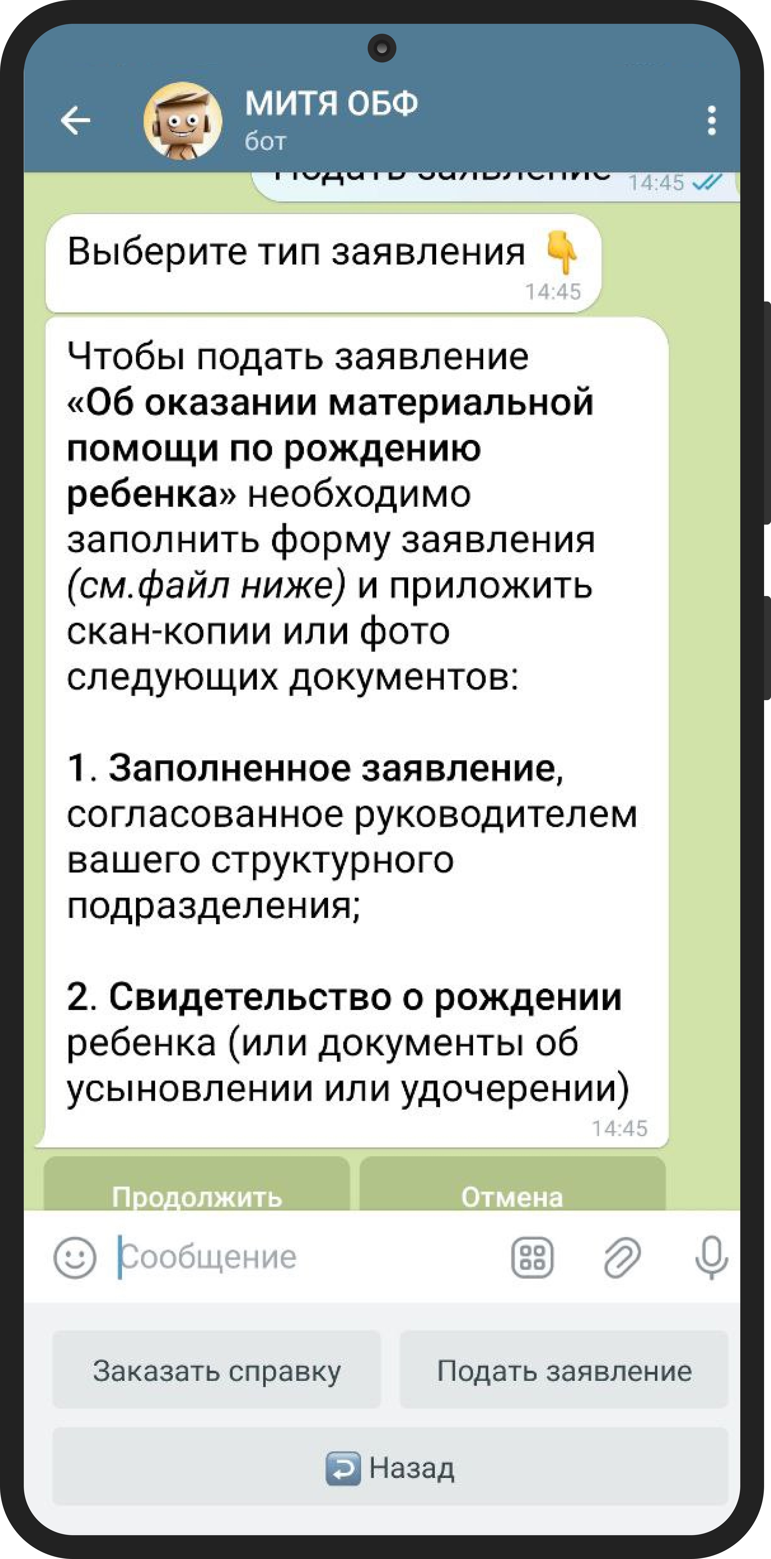 - Подача заявлений (на материальную помощь, отпуск и др.) с возможностью прикрепить сканы документов.