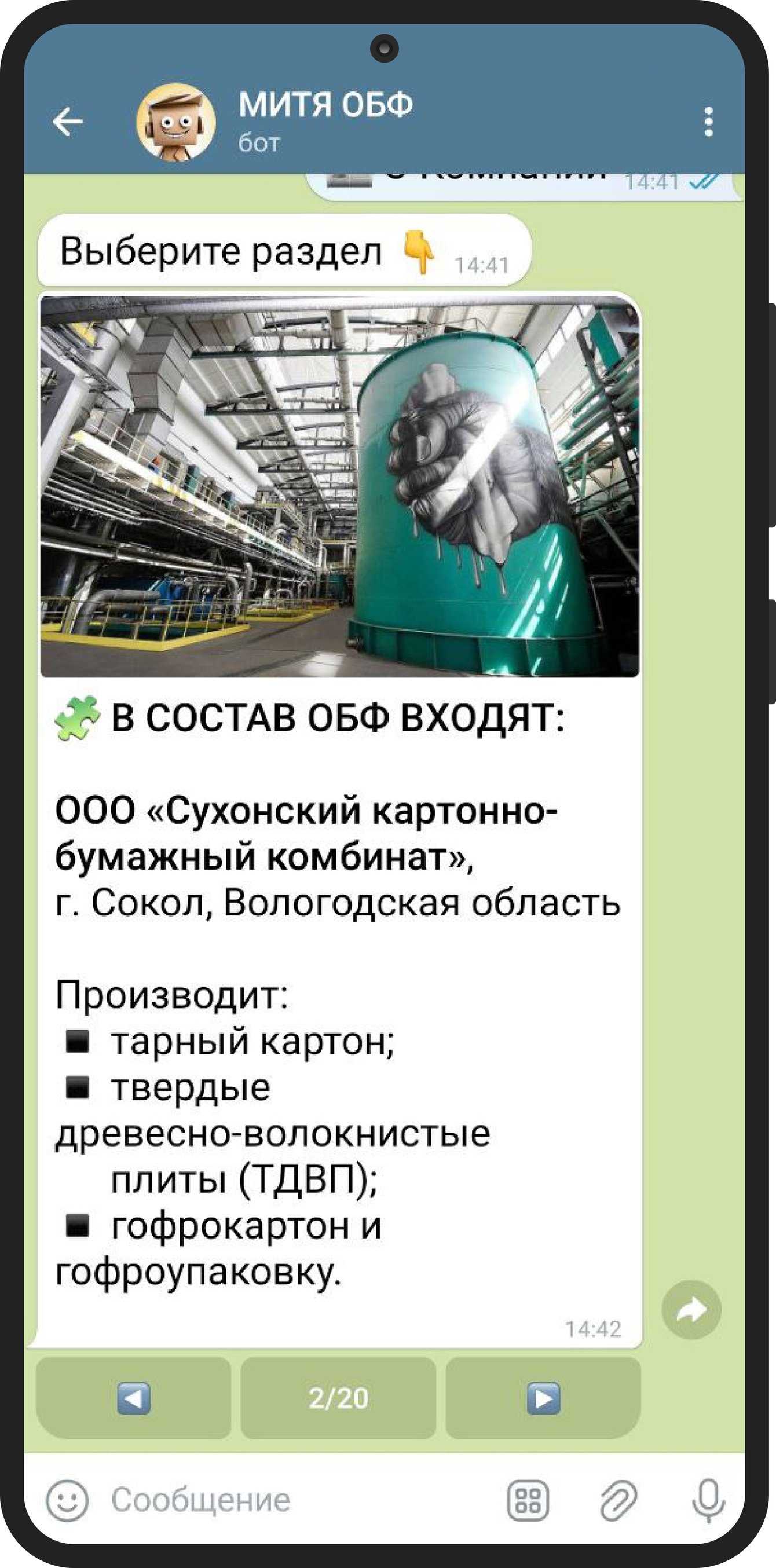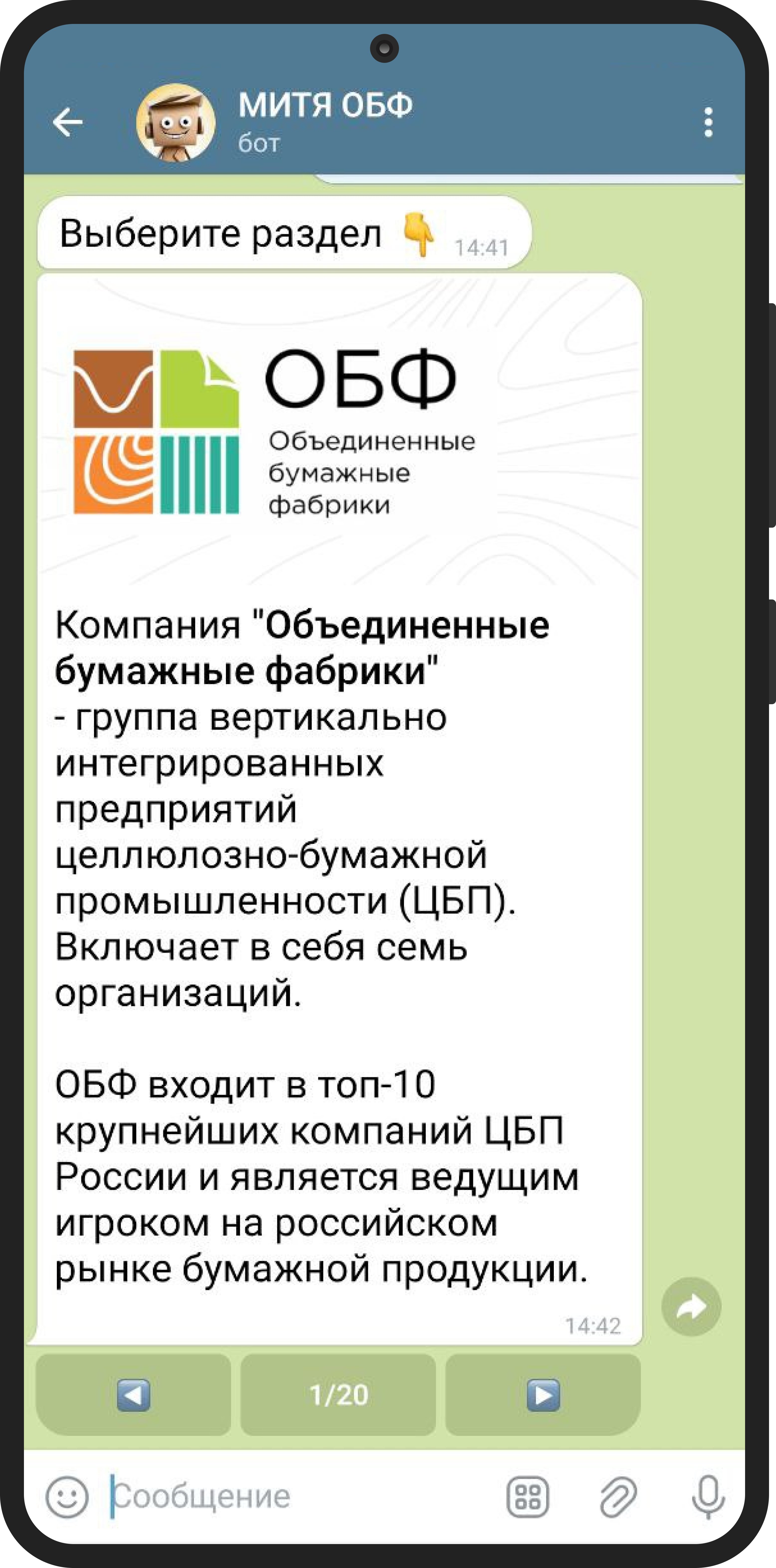 Компания «Объединенные бумажные фабрики» — крупный производственный холдинг с большой сетью предприятий и подразделений — обратился к нам для создания Telegram-бота, который решит следующие задачи: