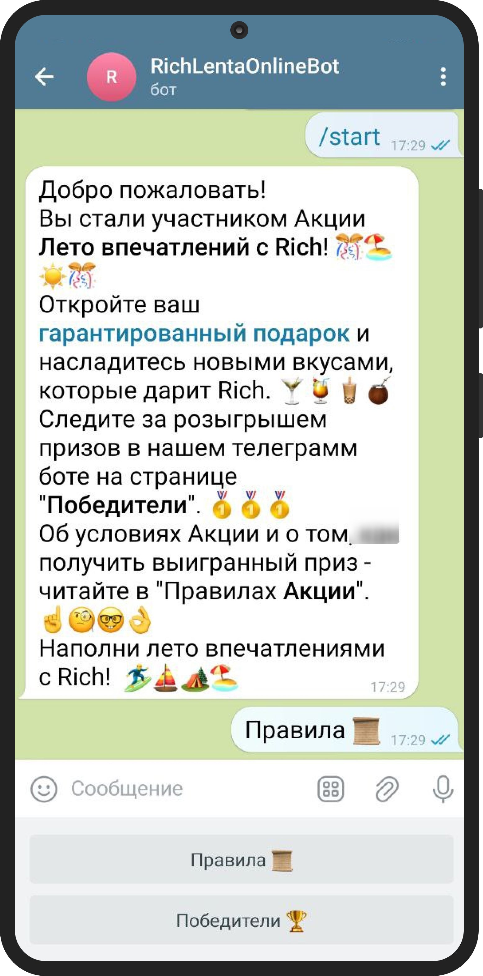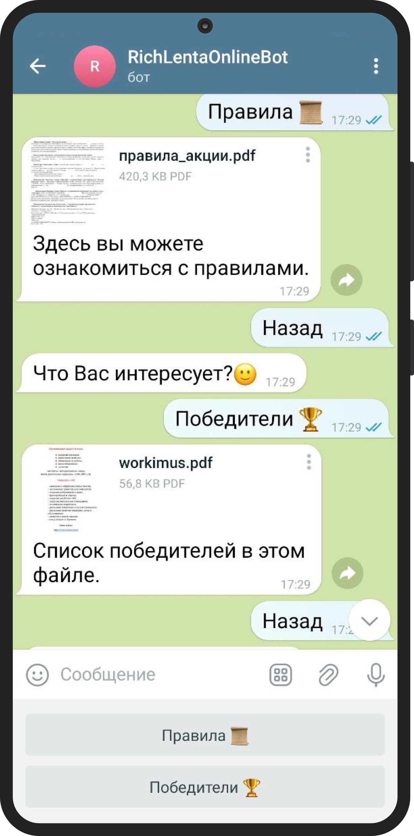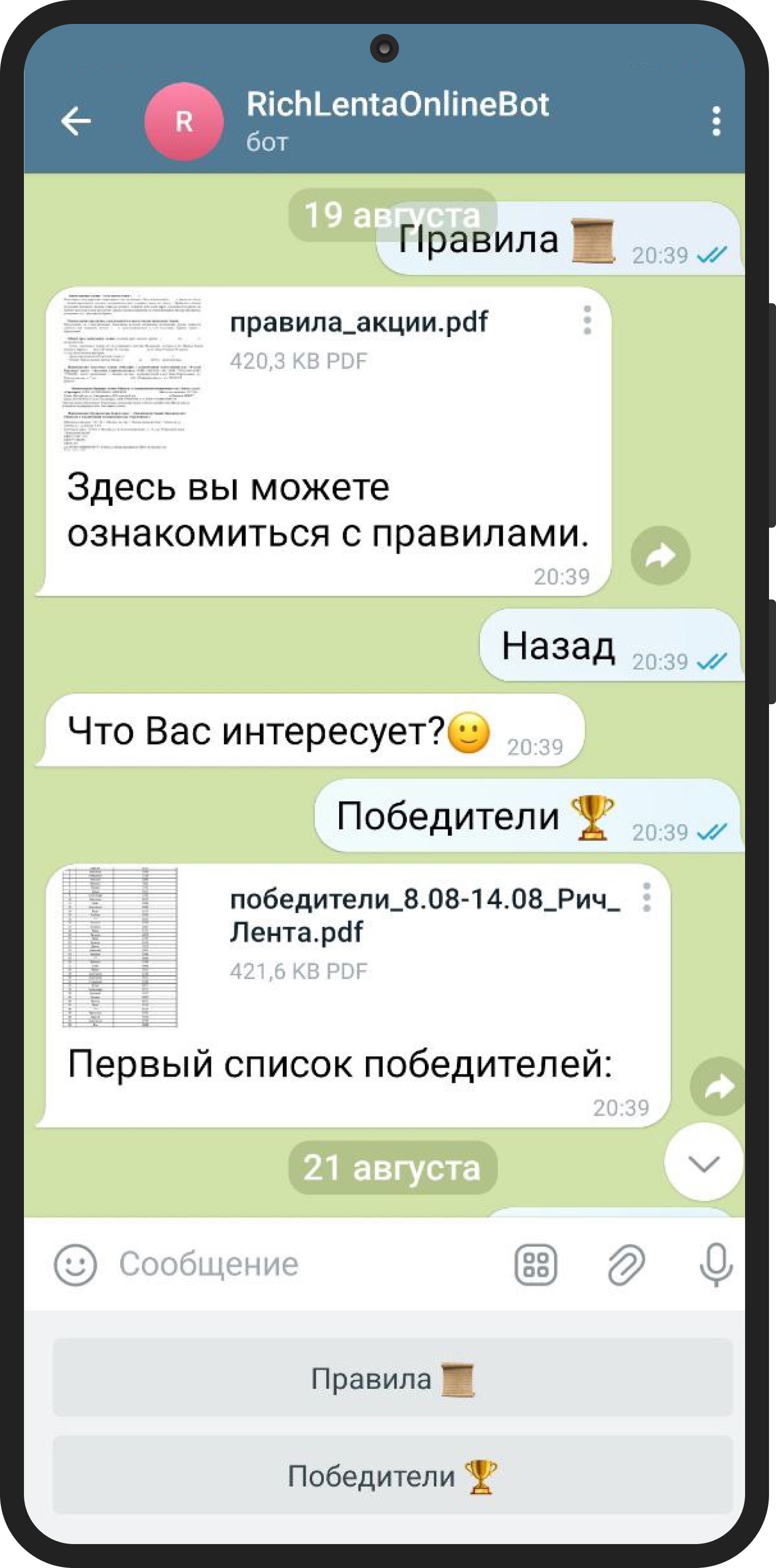 Создать простой и интуитивно понятный инструмент для информирования клиентов о правилах акции и победителях, а также автоматизировать процесс оповещений о выигрыше.