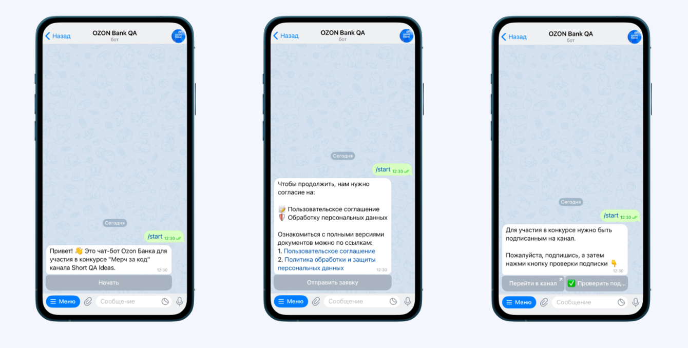 Пользователь запускает бота, указывает имя, телефон и подписывается на канал OZON Bank. После проверки подписки создаётся профиль, фиксируется Telegram ID и статус регистрации.