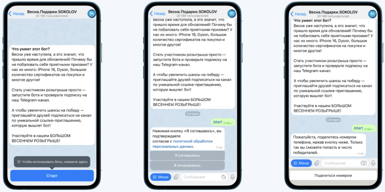 Пользователь нажимает /start, после чего бот собирает первичные данные: Telegram ID, никнейм и запрашивает согласие на обработку персональных данных. Далее требуется отправить номер телефона для завершения регистрации. Все данные сохраняются в базе и отображаются в админ-панели. Если пользователь не соглашается с политикой обработки данных, бот уведомляет его о невозможности участия.