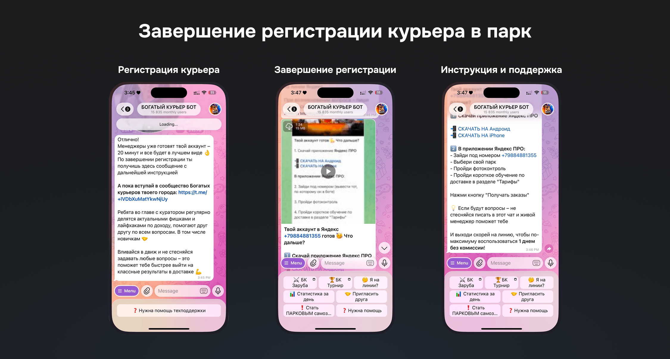 Основной интерфейс взаимодействия с исполнителем. Через бота курьер проходит ключевые сценарии: регистрацию, проверку документов, маршрутизацию по профилю, подключение к нужным чатам и получение инструкций. Здесь же запускаются сценарии сопровождения, поддержки и коммуникации на разных этапах пути.