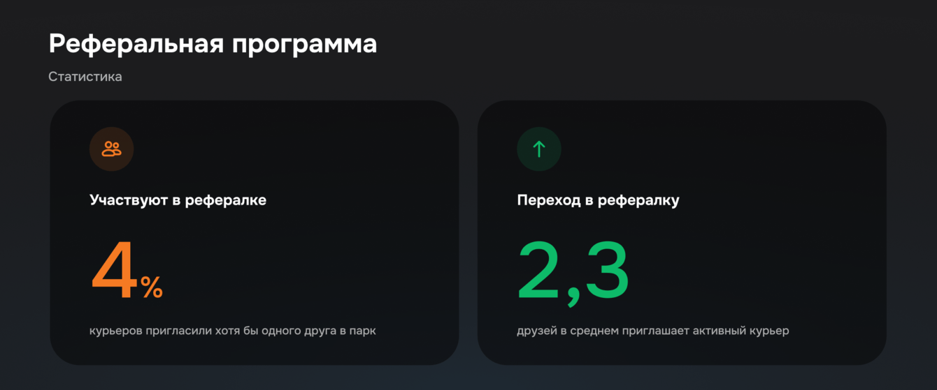 Сейчас через реферальный канал ежемесячно приходит около 1200 новых кандидатов. При этом сам канал оказался до 10 раз эффективнее стандартного привлечения через Яндекс и заметно дешевле для бизнеса. Одновременно это усиливает удержание: человек не просто работает в парке, а вовлекается в его жизнь через друзей и знакомых.
