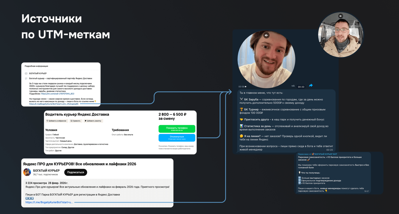 Путь начинается ещё до регистрации — в момент, когда будущий курьер кликает по ссылке в объявлении на авито, VK клипе, видео на Youtube или сообщении от друга с реферальной ссылкой. Уже на этом этапе система фиксирует источник перехода через систему UTM-меток.