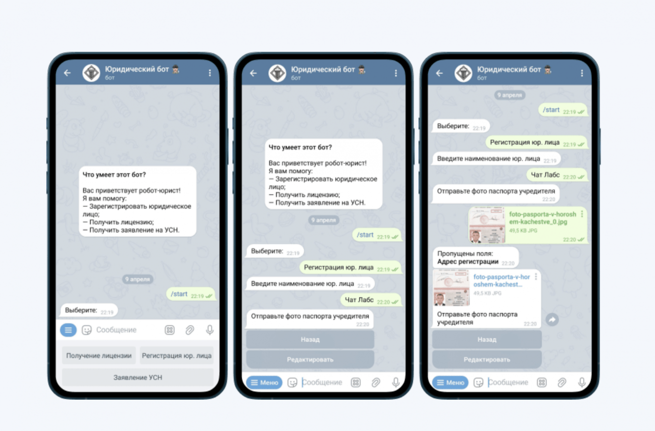 После нажатия кнопки «Start» бот присылает приветственное сообщение и три варианта действий: «Получение лицензии», «Регистрация юридического лица» и «Заявление УСН». Если пользователь выбирает «Получение лицензии», бот запрашивает следующие документы: учредительные документы, выписку из ЕГРЮЛ, документ, подтверждающий наличие уставного капитала, документ, подтверждающий наличие у заявителя в собственности, хозяйственном ведении или аренде, срок которой определен договором и составляет один год и более, помещения не менее 20 кв. м., платежное поручение об оплате государственной пошлины за выдачу лицензии. При регистрации юридического лица бот запрашивает следующие документы: паспортные данные учредителей, наименование юридического лица, размер уставного капитала, юридический адрес предприятия, номер телефона учредителей, адрес электронной почты. Самой простой веткой в данном боте является «Заявление УСН». В данном случае мы запрашиваем у пользователя только выписку из ЕГРЮЛ.
