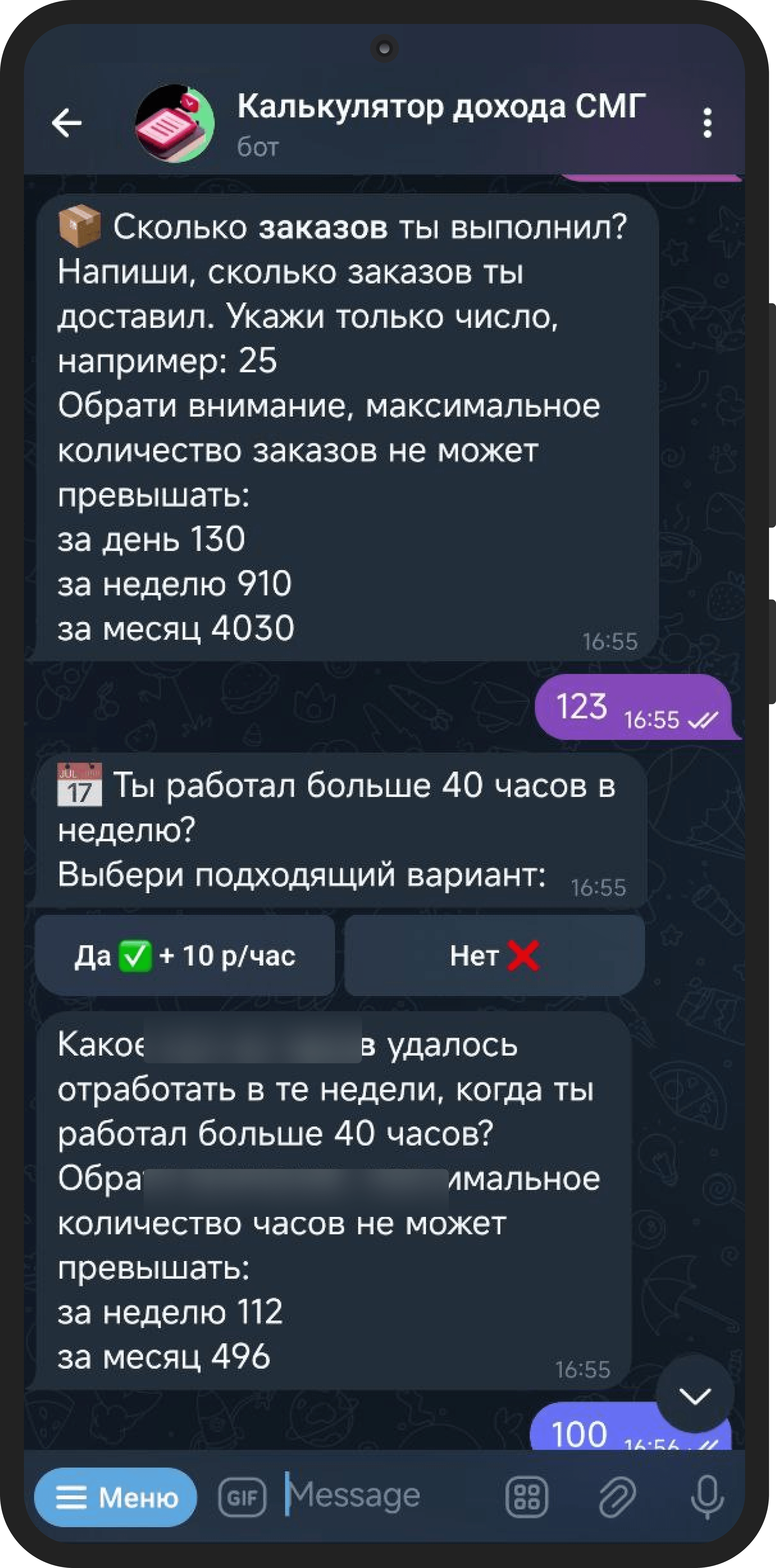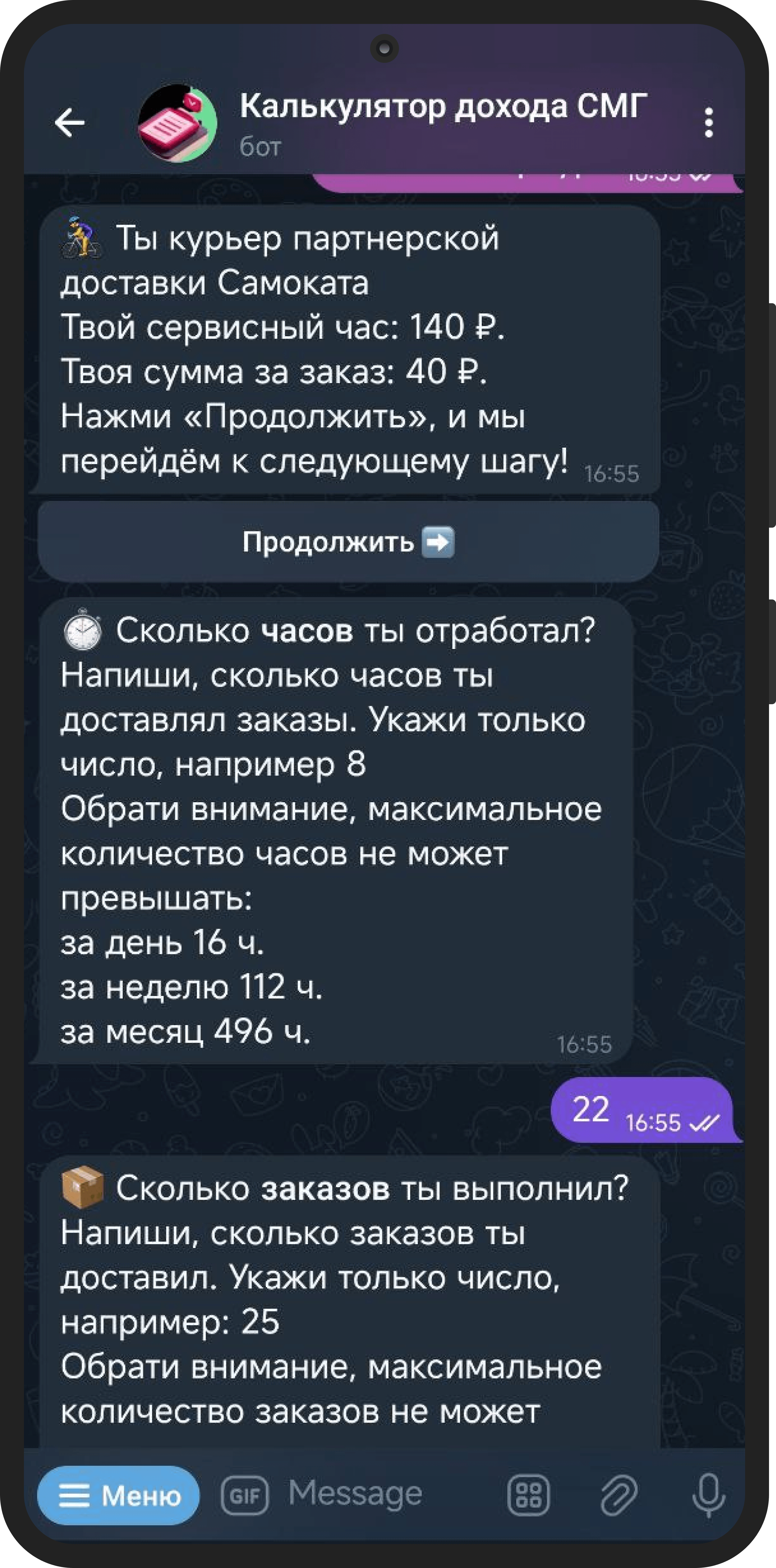 В ходе сотрудничества ваша команда разработала удобный и понятный Telegram-бот, позволяющий в течение одной минуты произвести точный расчет дохода велокурьера. Организовала прозрачный сценарий взаимодействия с пользователем, исключающий ошибки и позволяющий быстро разобраться в деталях расчета. Это позволило нам сократить количество однотипных вопросов от сотрудников, минимизировать ошибки ручных расчетов и значительно повысить прозрачность коммуникации с кандидатами и курьерами