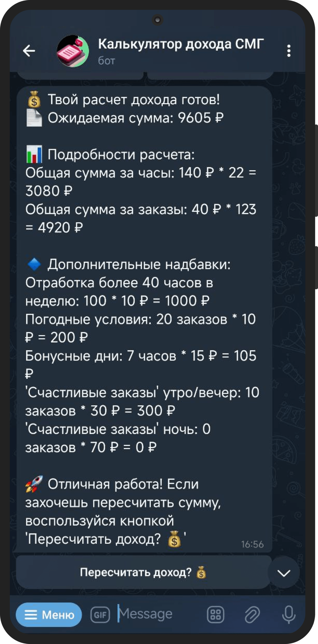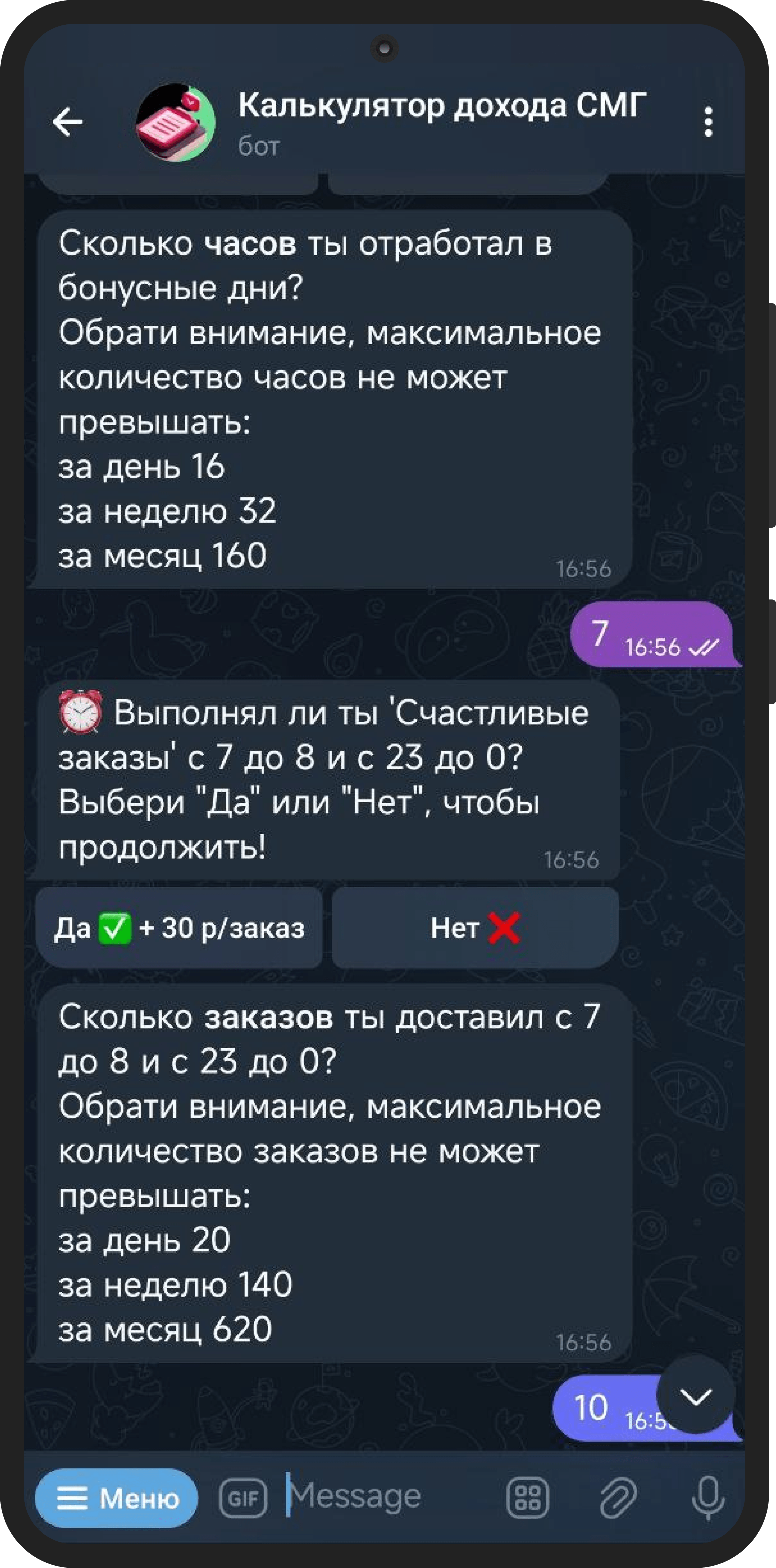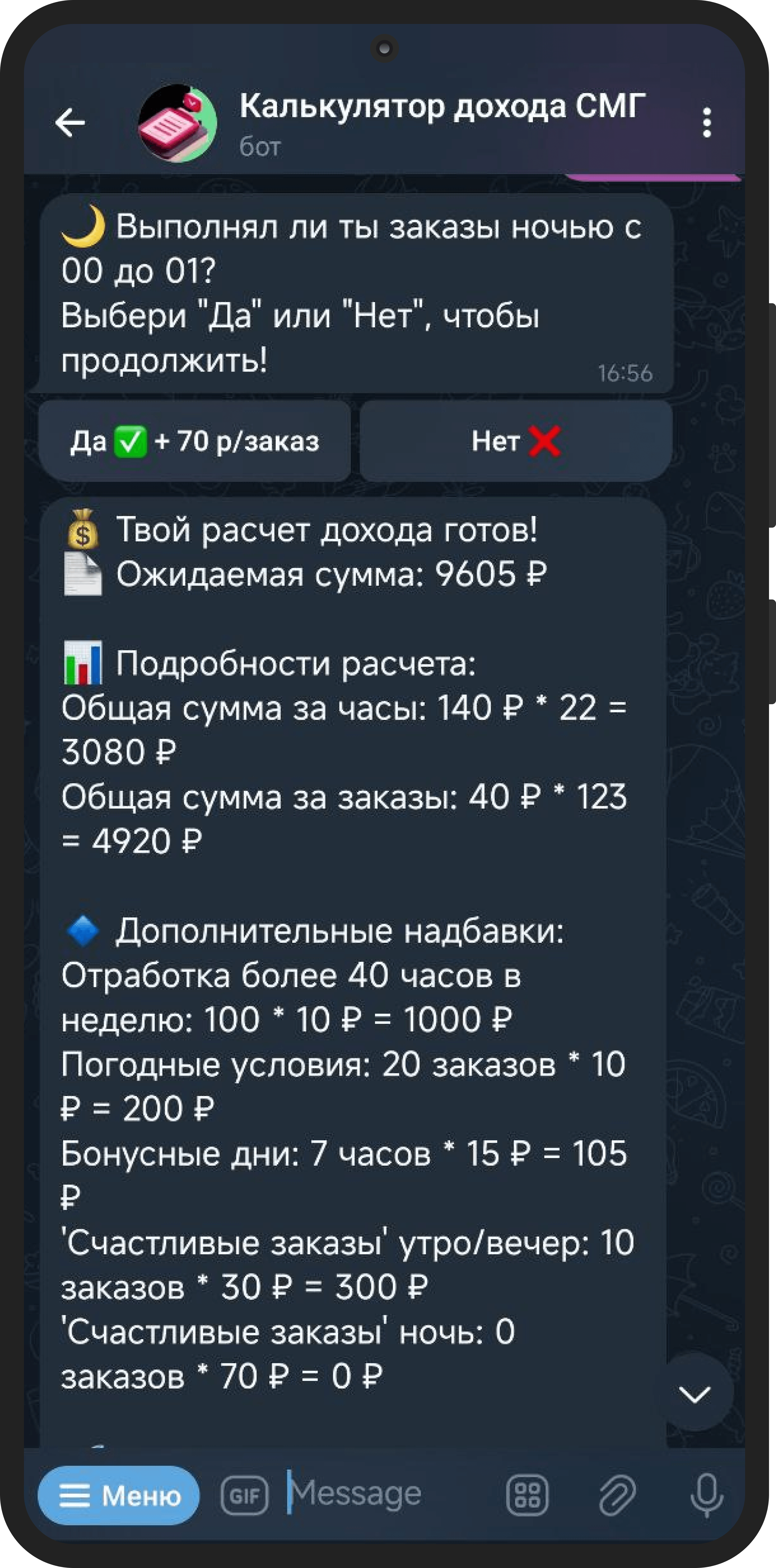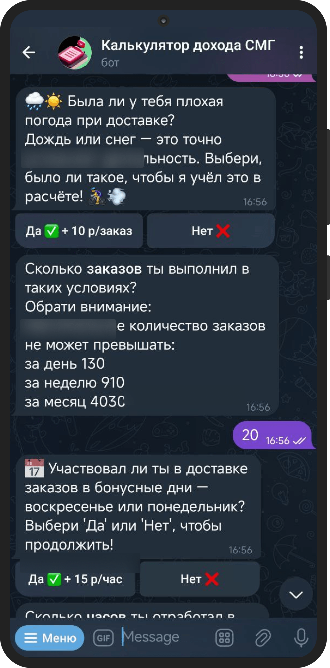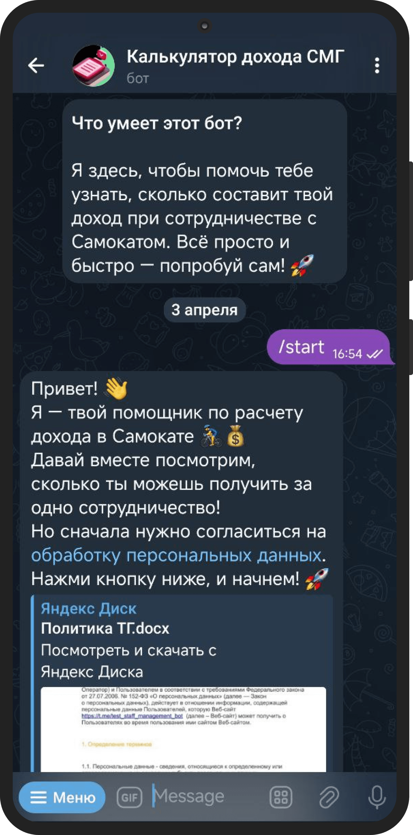 Этот чат-бот — не просто калькулятор. Это точка входа в честную и понятную коммуникацию между компанией и велокурьером.