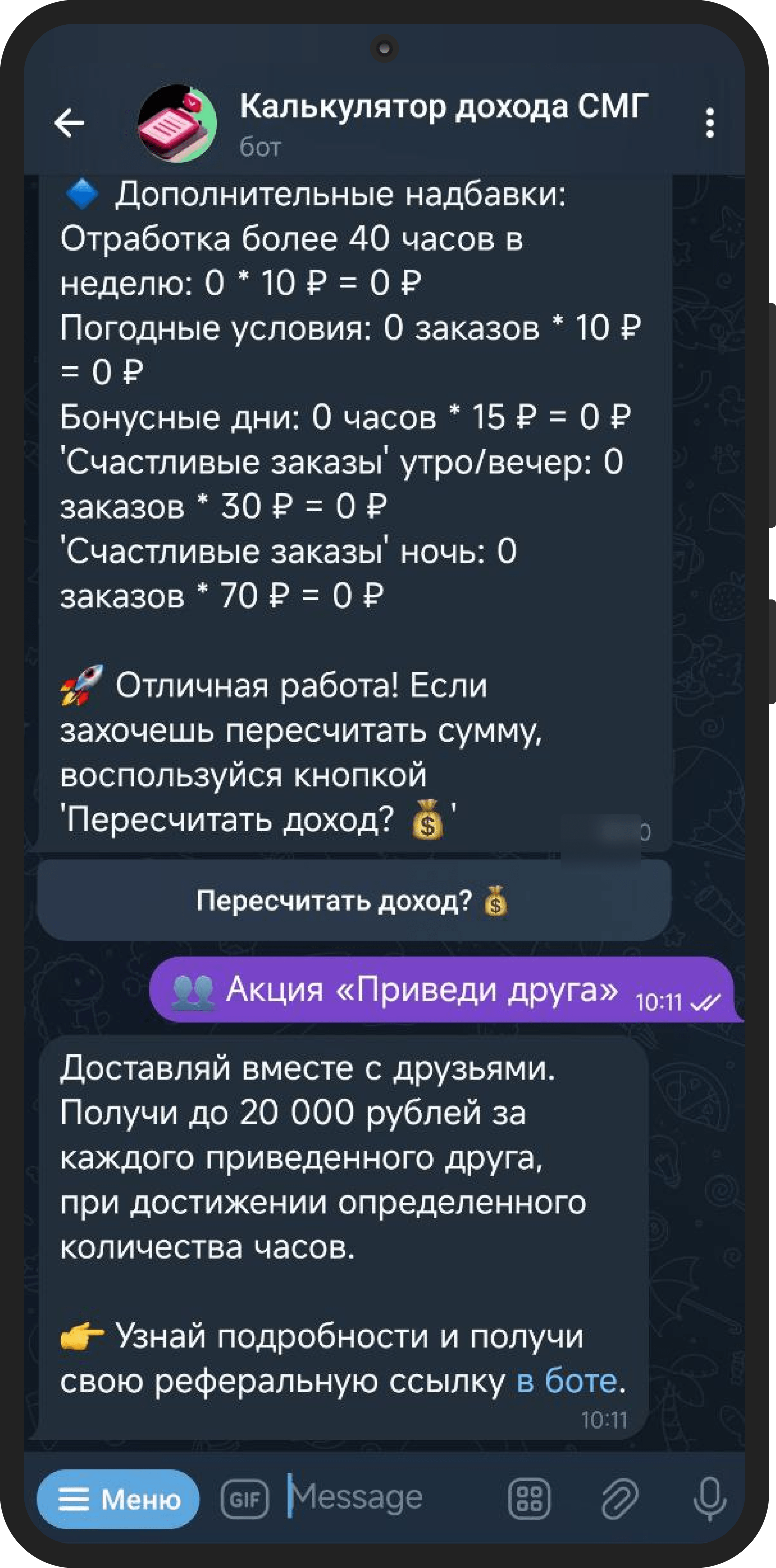 Чуть позже, уже после сдачи проекта, заказчик обратился с просьбой добавить в бот дополнительную функцию — кнопку с переходом на реферальную акцию. Мы оперативно внесли доработку: теперь пользователь видит кнопку «Акция Приведи друга», которая ведет в отдельный реферальный бот компании. Это помогает не только усилить вовлеченность действующих курьеров, но и привлечь новых соискателей напрямую через Telegram.