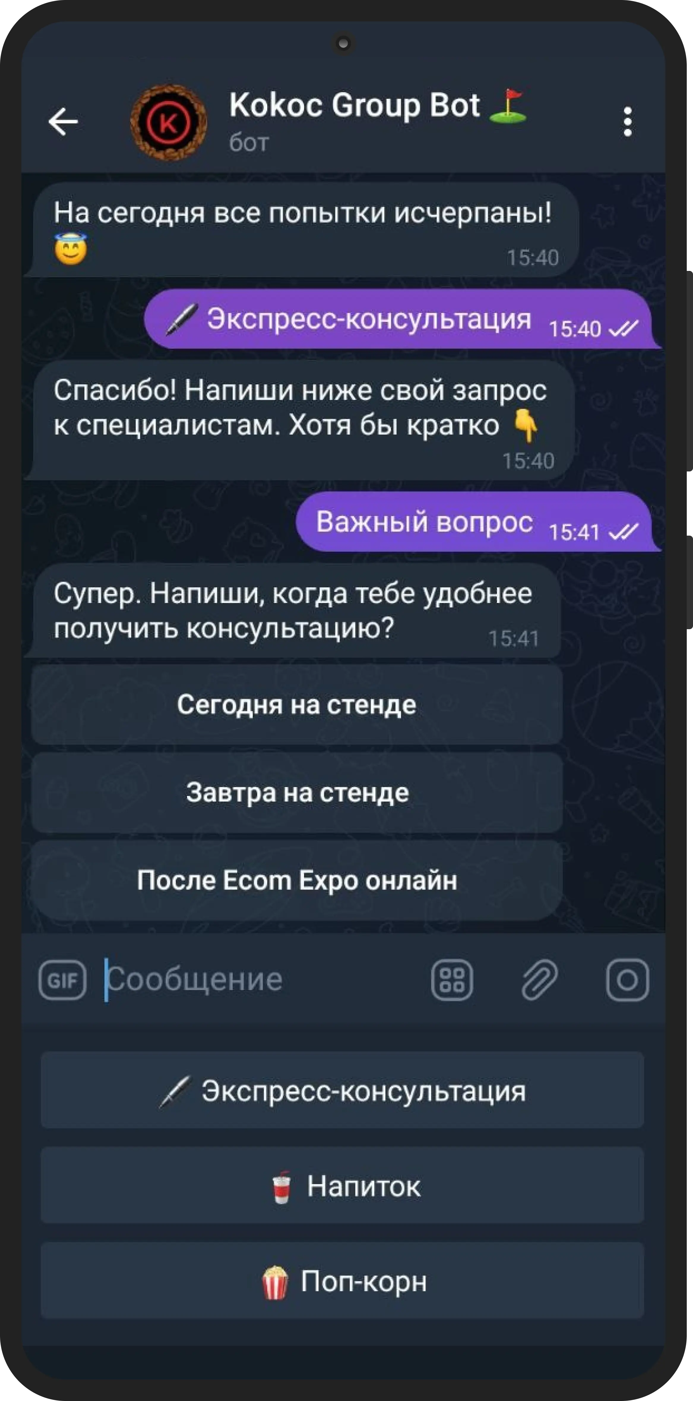 Представьте: вы на крупном мероприятии, вокруг шум, люди, стенды. Как выделиться среди сотен компаний и привлечь внимание гостей? Команда Kokoc Group нашла оригинальное решение — чат-бот, который не только собирал данные посетителей, но и угощал их попкорном и напитками за активность. А мы помогли воплотить эту идею в жизнь всего за 5 дней!
