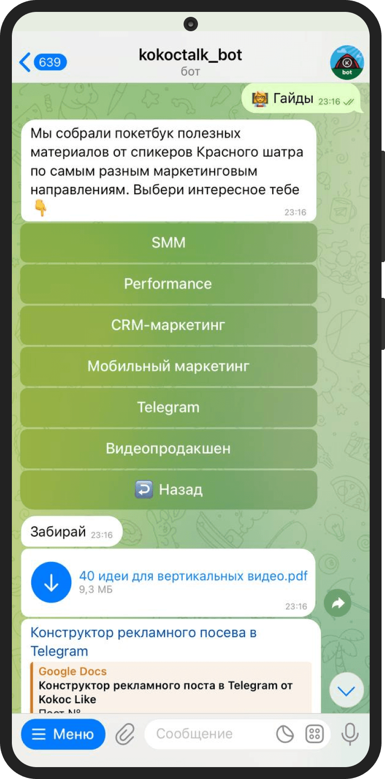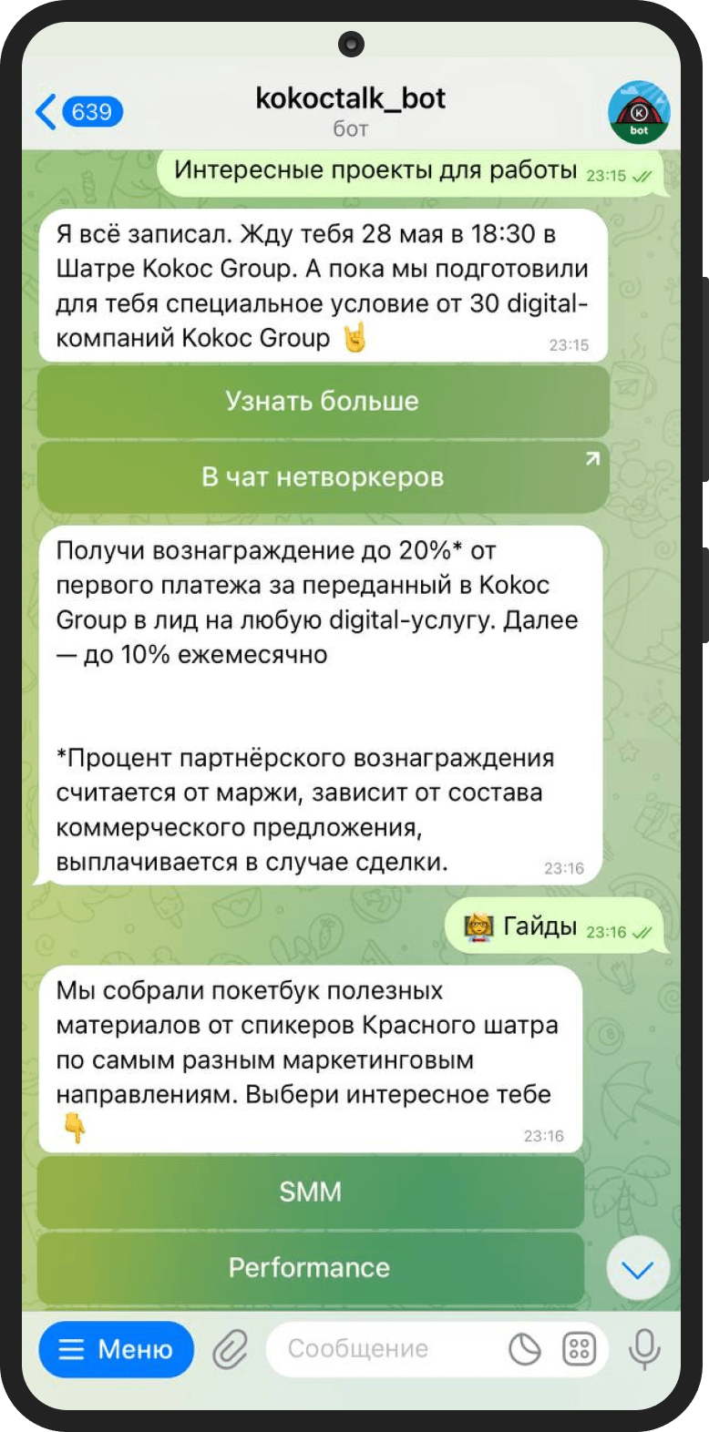 Получался выгодный обмен между двумя сторонами: посетители шатра указывали свои контактные данные в чат-боте, чтобы бесплатно получать полезные гайды и бонусные подарки, а Kokoc Group, бережно сохранив эти данные, могла использовать их в будущем для продажи собранным контактам своих агентских услуг.