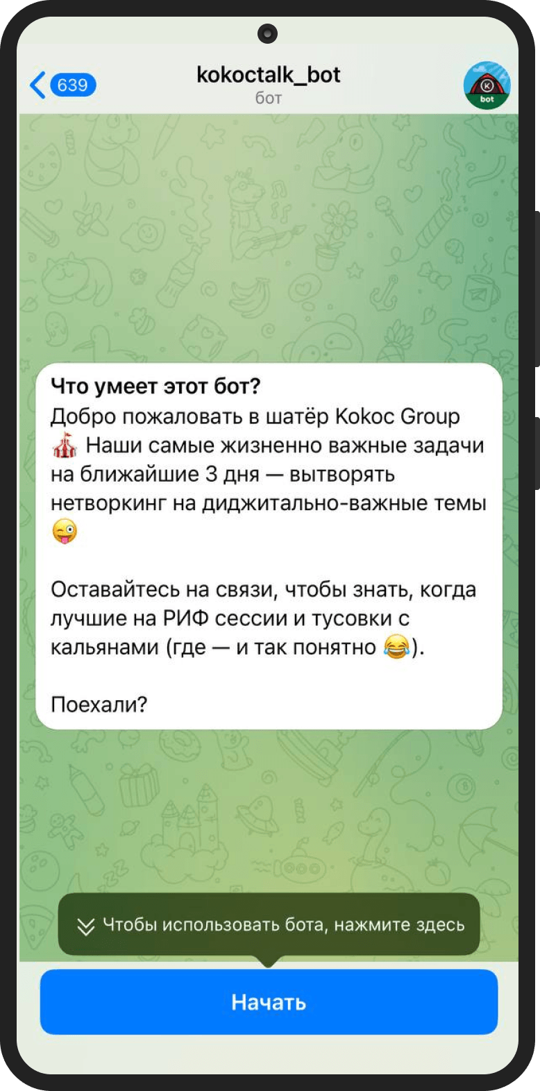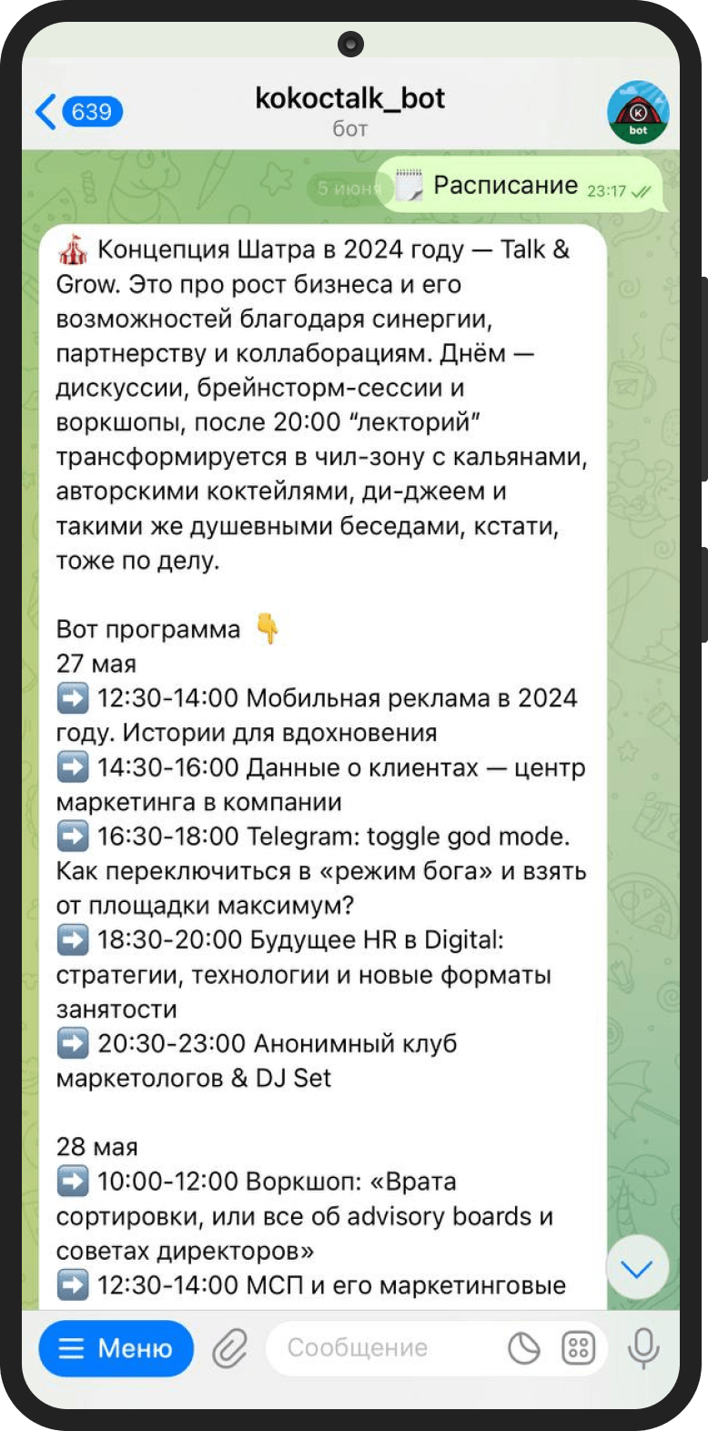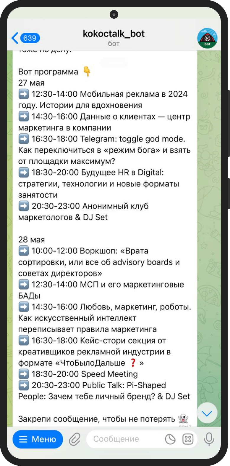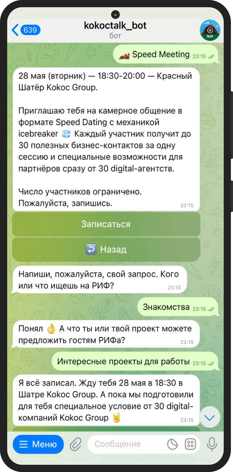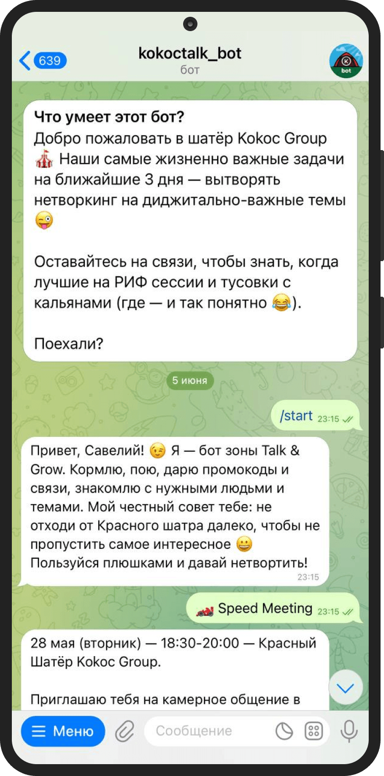 Для чат-бота Kokoc Talk мы добавили лучшие механики прошлых лет. Получился навигатор по мероприятию, который: