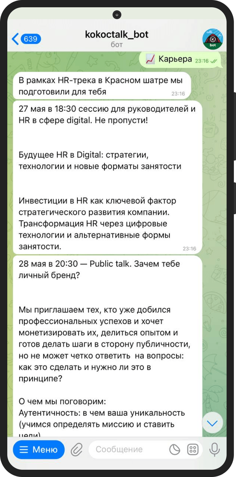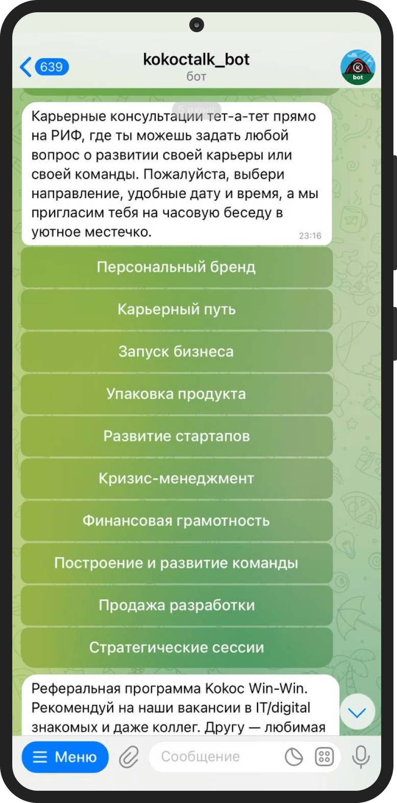 — ориентировал по карьерной информации: показывал расписание тематических выступлений, помогал записаться на карьерную консультацию тет-а-тет и рассказывал о реферальной программе Kokoc Win-Win
