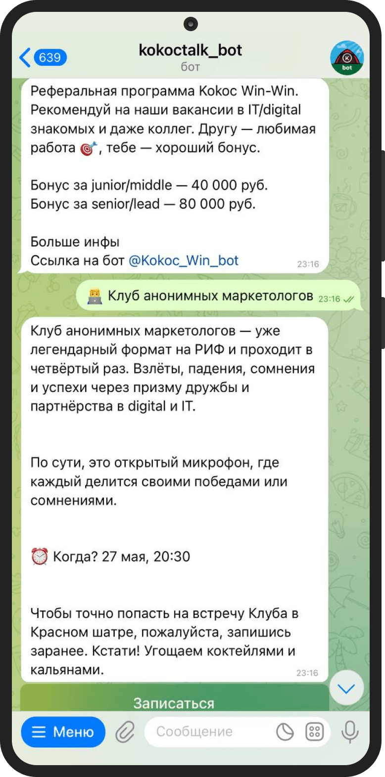 — давал возможность записаться на встречу клуба анонимных маркетологов: можно было поучаствовать в открытом микрофоне для специалистов в digital и IT