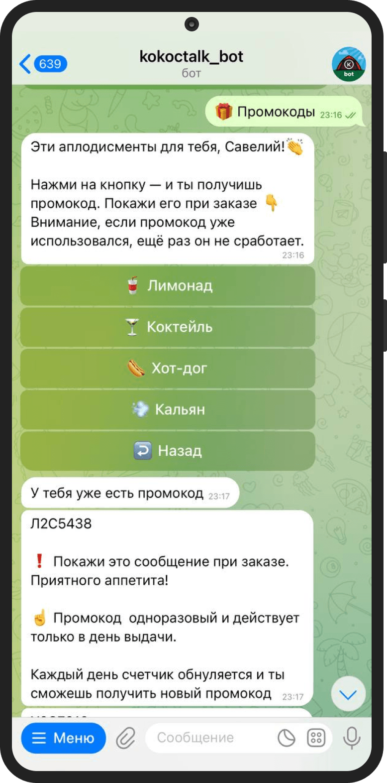 Для выдачи промокодов мы реализовали техническое ограничение. Каждый из запустивших чат-бота мог получить только один промокод в течение 24 часов.