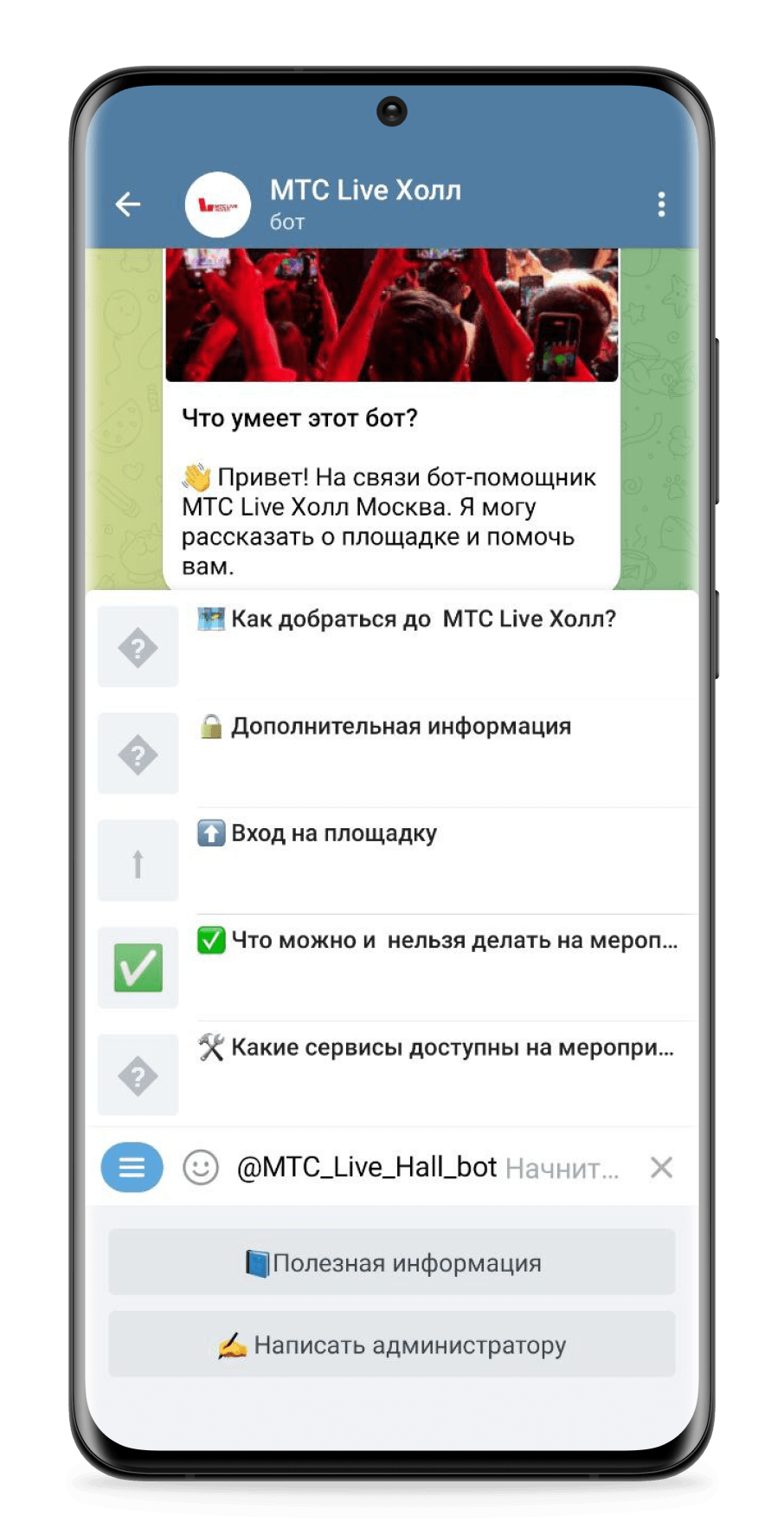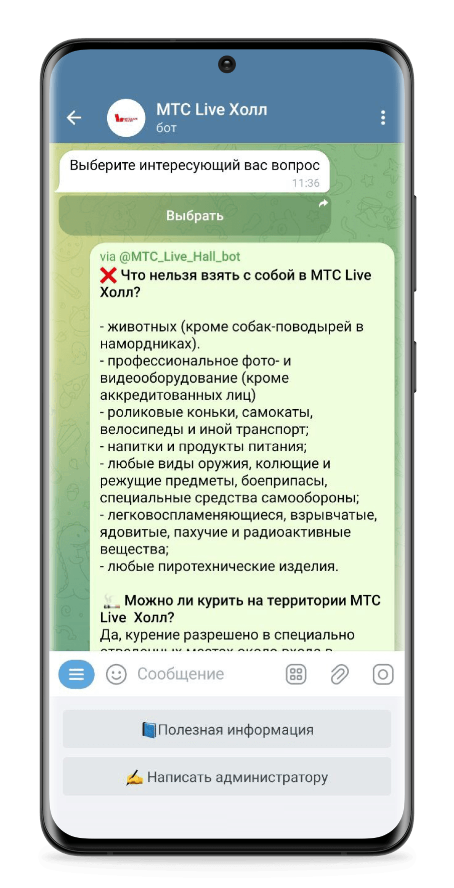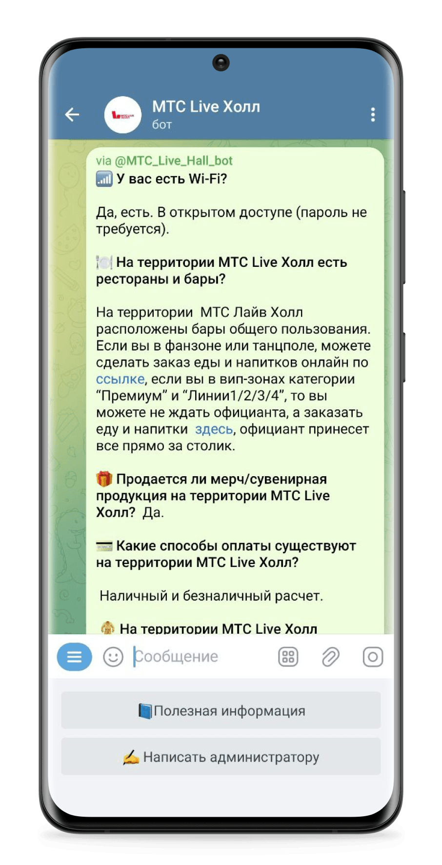 Использование чат-бота помогло организаторам обеспечить удобство и оперативность в общении с аудиторией концертной площадки. Мы создали инновационный инструмент, который значительно упростил взаимодействие с посетителями, обеспечивая им быстрый доступ к необходимой информации. Этот инструмент не только улучшает работу организаторов сегодня, но и служит фундаментом для будущего развития, помогая создавать лучшие условия для отдыха и развлечений на концертной площадке МТС Live Холл.