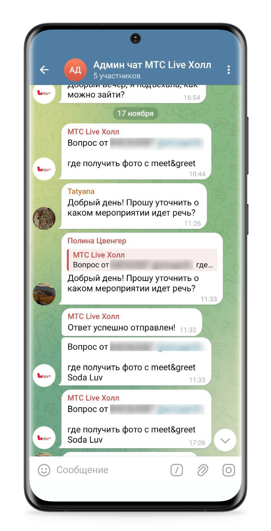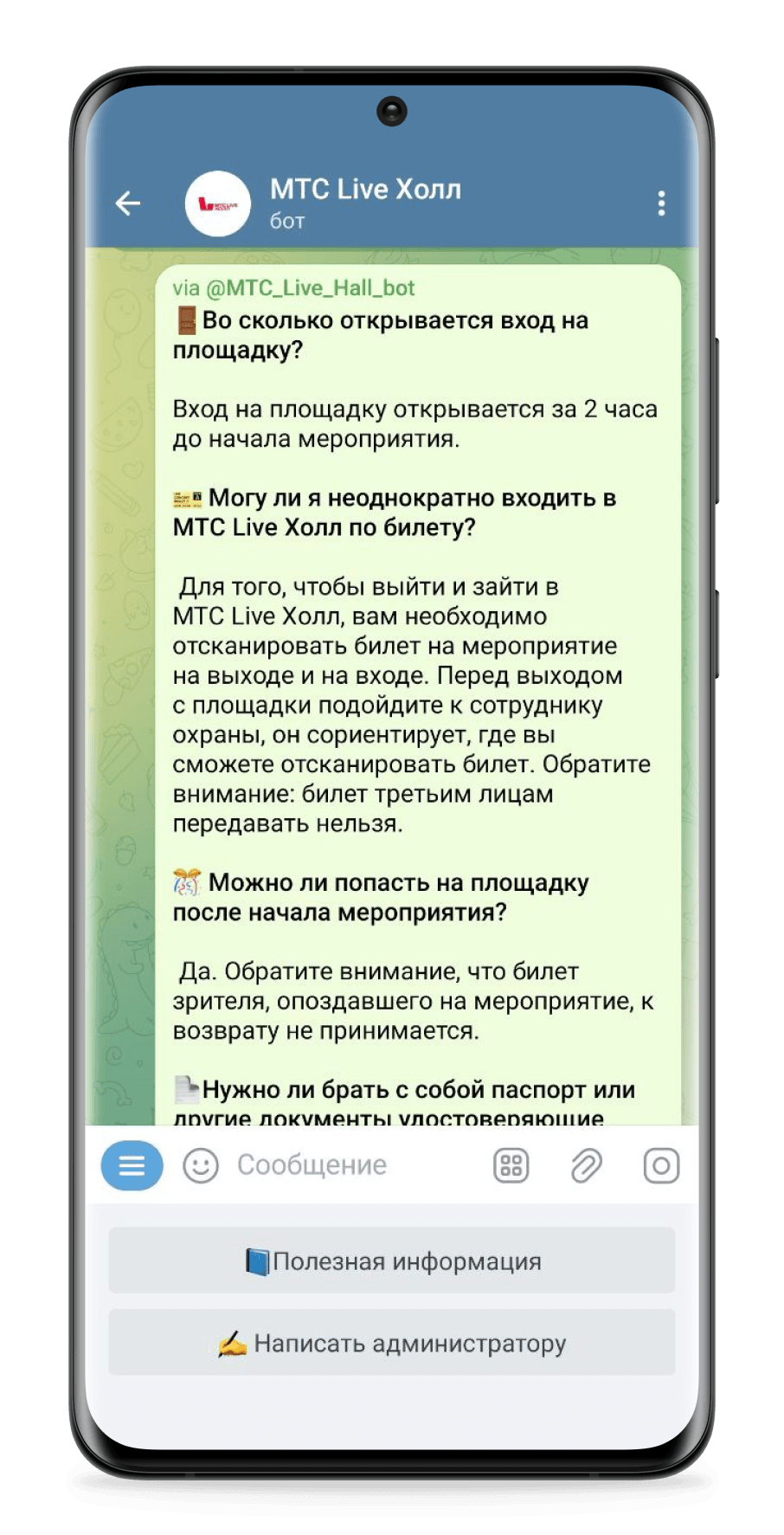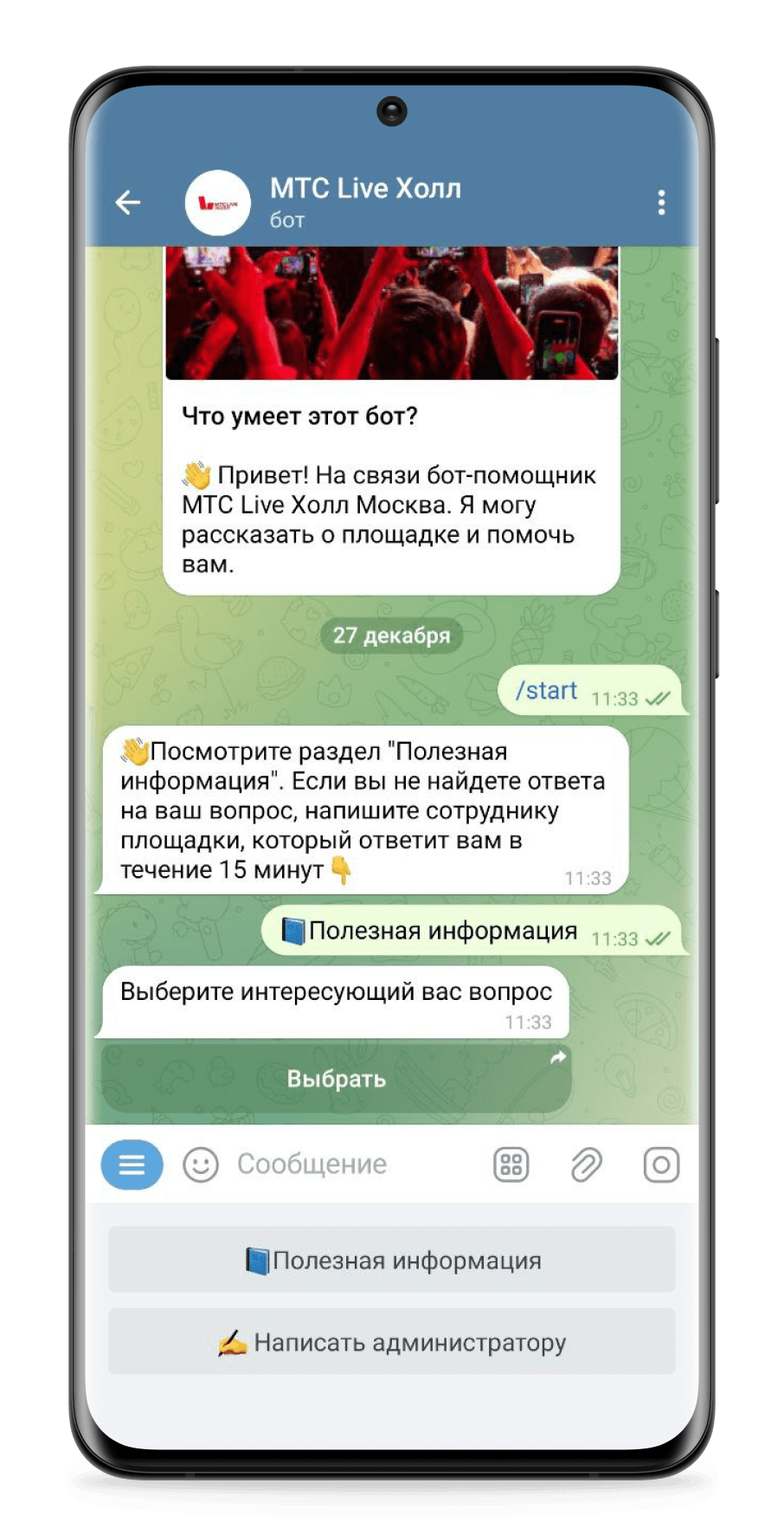 Использование чат-бота помогло организаторам обеспечить удобство и оперативность в общении с аудиторией концертной площадки. Мы создали инновационный инструмент, который значительно упростил взаимодействие с посетителями, обеспечивая им быстрый доступ к необходимой информации. Этот инструмент не только улучшает работу организаторов сегодня, но и служит фундаментом для будущего развития, помогая создавать лучшие условия для отдыха и развлечений на концертной площадке МТС Live Холл.