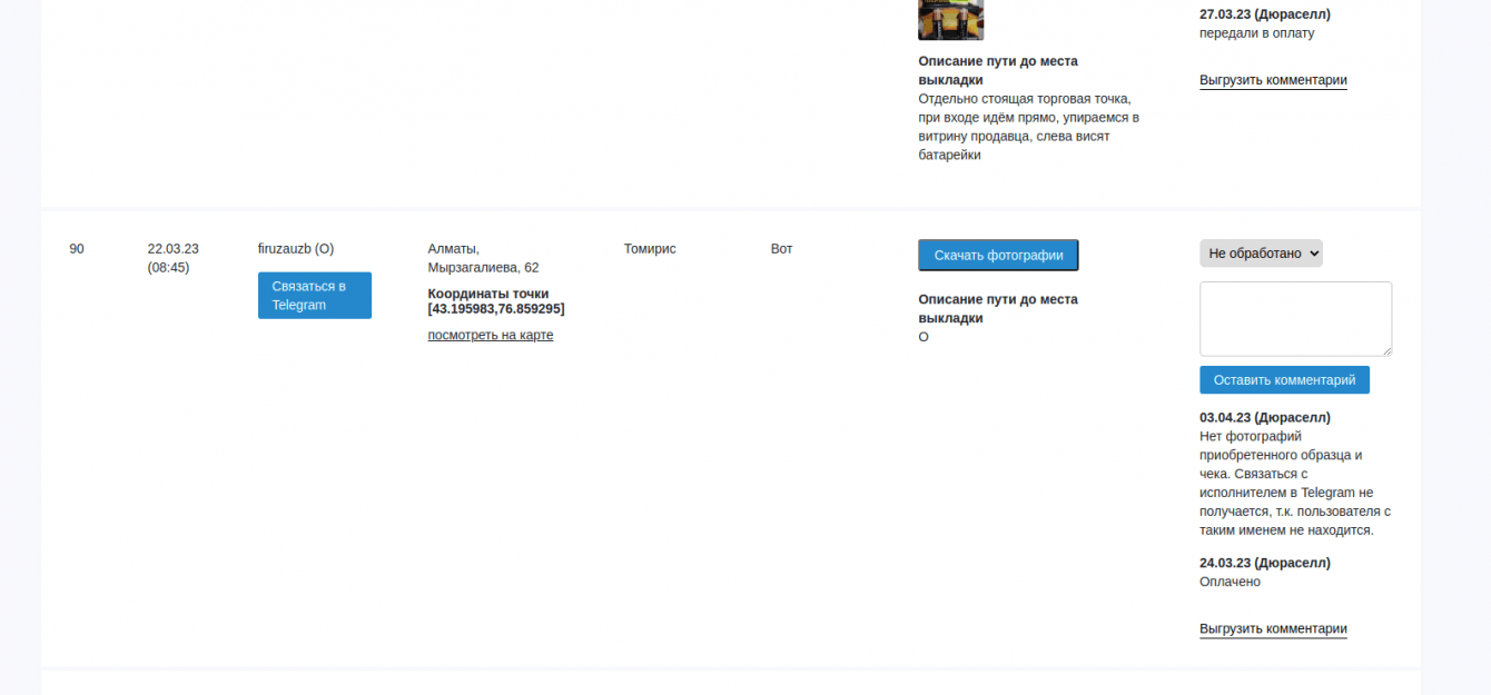 Также мы реализовали в бэк-офисе возможность изменения статусов и оставления комментариев, чтобы иметь представление о текущем состоянии задачи по каждой торговой точке. Это позволяет легко отслеживать процесс выполнения задач и хранить комментарии, которые помогают понять текущий статус работы над каждой задачей.