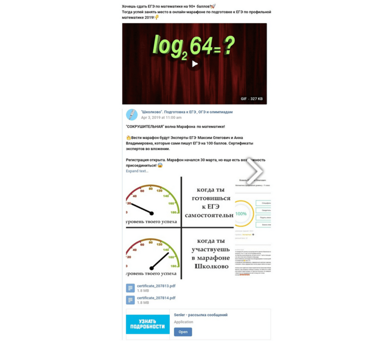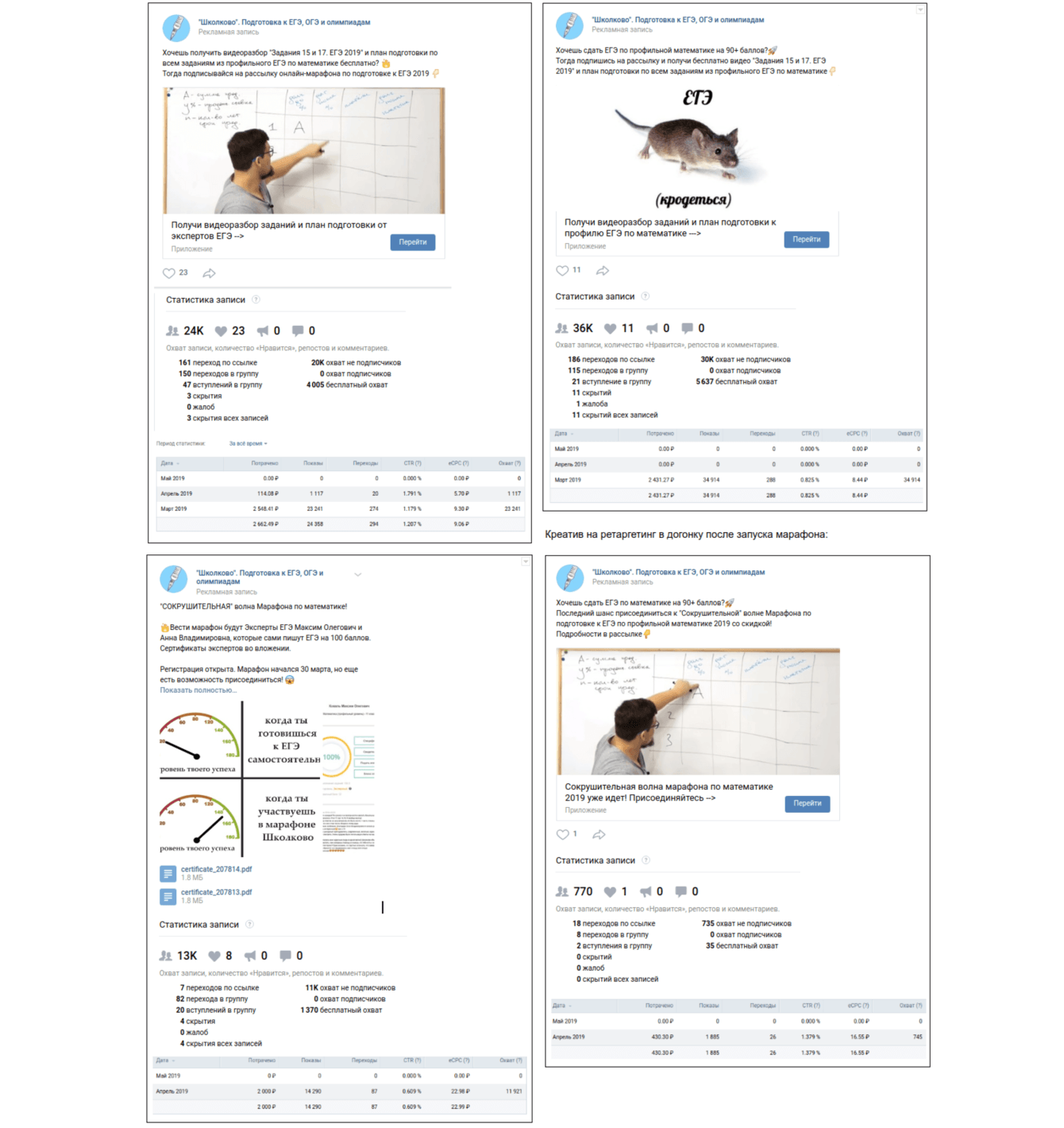 2. Провели несколько тестовых кампаний с разными креативами на собранные базы. По прошлому опыту с проектом «Школково» сразу решили использовать только промо-посты с кнопкой на подписку в рассылку → автоматическая подписка и запуск бота, а также протестировали универсальный пост.