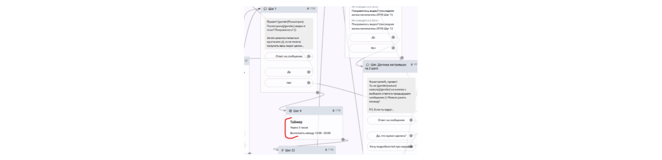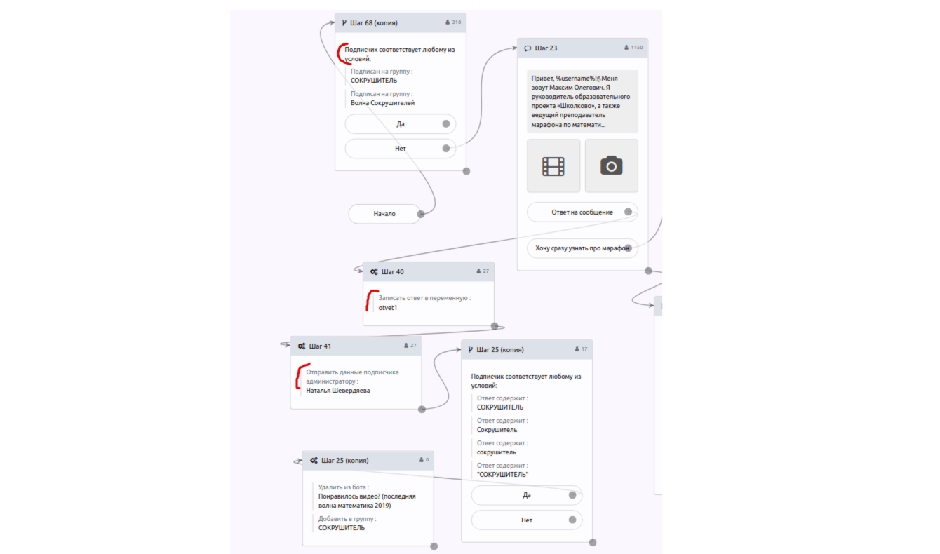 Когда мы первый раз строили структуру автоворонки и чат бота, то предполагали, что пользователь будет идти линейно, и только пару моментов подстраховали, где ЦА может «свернуть не туда».