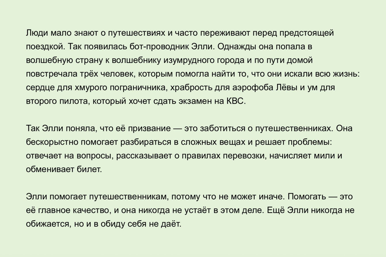 Мы придумали не просто чат-бота, а настоящего бот-проводника Элли. Это смелая, лёгкая в общении, предприимчивая, активная и правильная девушка возрастом 31 год. Элли родилась так: