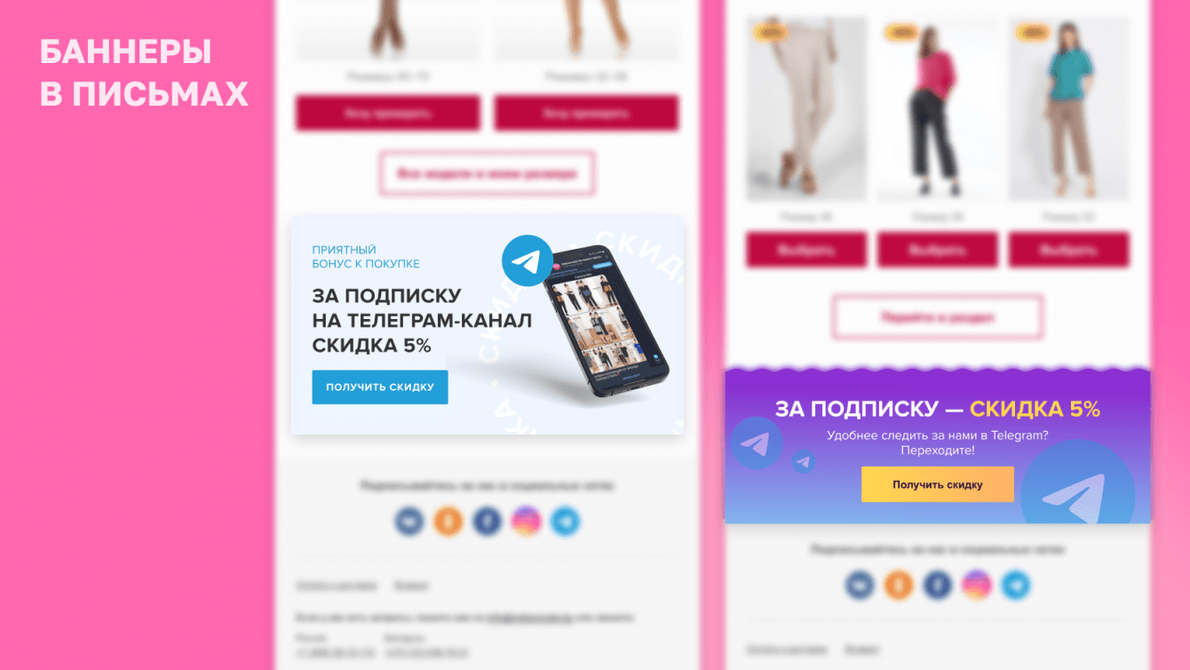 Мы ведем канал email-маркетинга для VelesModa и в некоторые письма помещаем баннеры с призывом подписаться на телеграм: