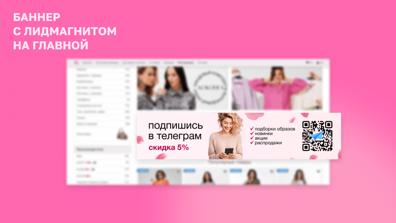 Механика чат-бота VelesModa получилась следующей. На сайте магазина расположен баннер с лид-магнитом — дарим скидку 5% за подписку на телеграм-канал: