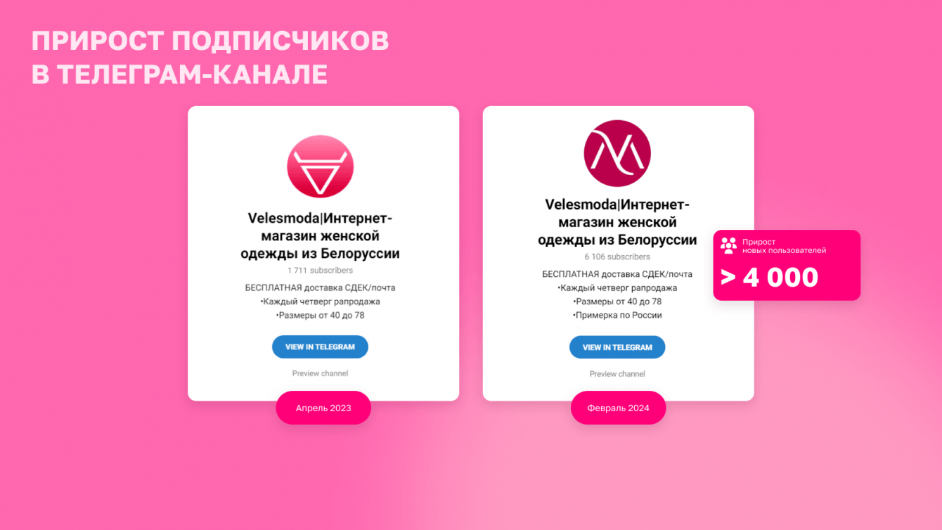 – До запуска бота у канала VelesModa было 1,7 тыс. подписчиков, за первые месяцы бот привлек новых пользователей, стало почти 3 тыс. подписчиков. Бот продолжает собирать новых пользователей, и сегодня, на февраль 2024 года, в канале уже более 6 тыс. человек. Каждый из них — реальный или потенциальный покупатель магазина.