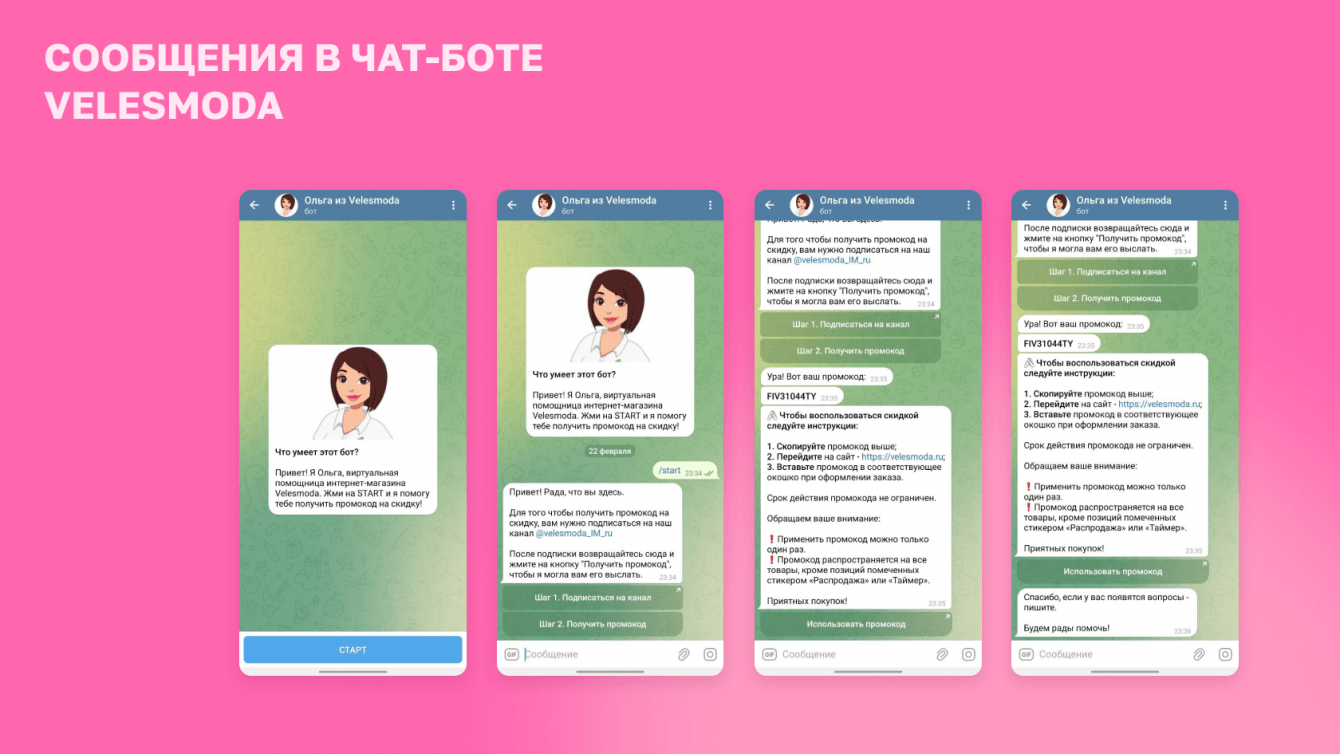 Мы предложили клиенту коммуницировать с подписчиками от лица виртуальной помощницы Ольги. Чтобы получить промокод на скидку, она предлагает подписаться на телеграм-канал магазина.