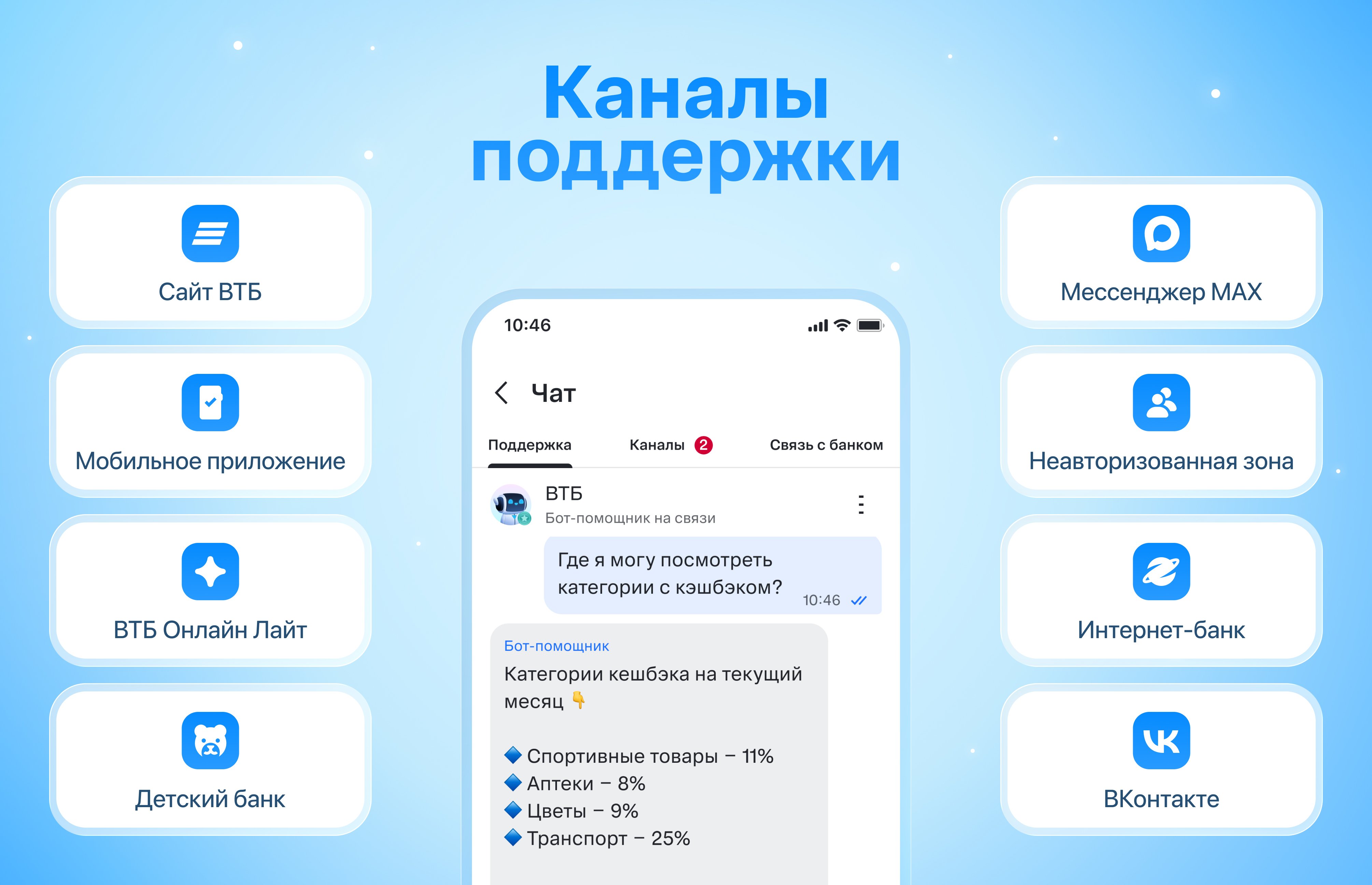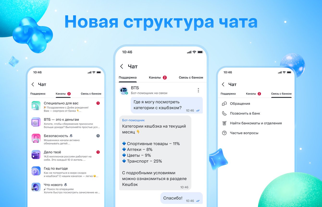 Чат трансформирован в платформу с тремя разделами: «Поддержка» (диалог с ботом и операторами), «Каналы» (лента с персонализированными рассылками + публичные каналы по различным темам), «Связь с банком» (статус обращений, онлайн-звонок в банк, карта банкоматов, ответы на часто задаваемые вопросы). Добавлены функции из популярных мессенджеров: реакции, отправка стикеров, сортировка файлов в медиагалерее. Кроме того, реализован таймер ожидания оператора с обратным отсчётом и обновлена система оценки CSI.