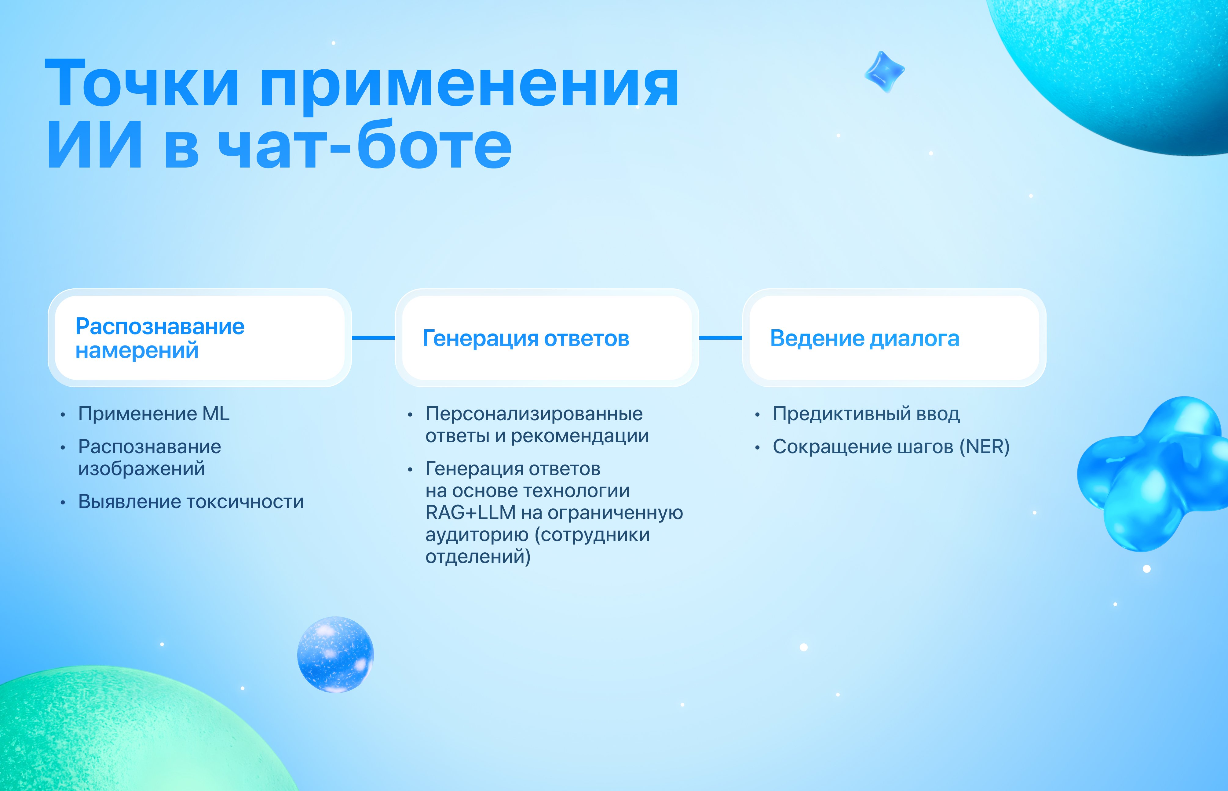 3. Внедрить ИИ-технологии нового поколения. Переход от правил и простых ML-моделей к многоуровневому ИИ: NER для сокращения шагов диалога, модели компьютерного зрения, проактивной персонализации, детектированию эмоционального состояния клиента.