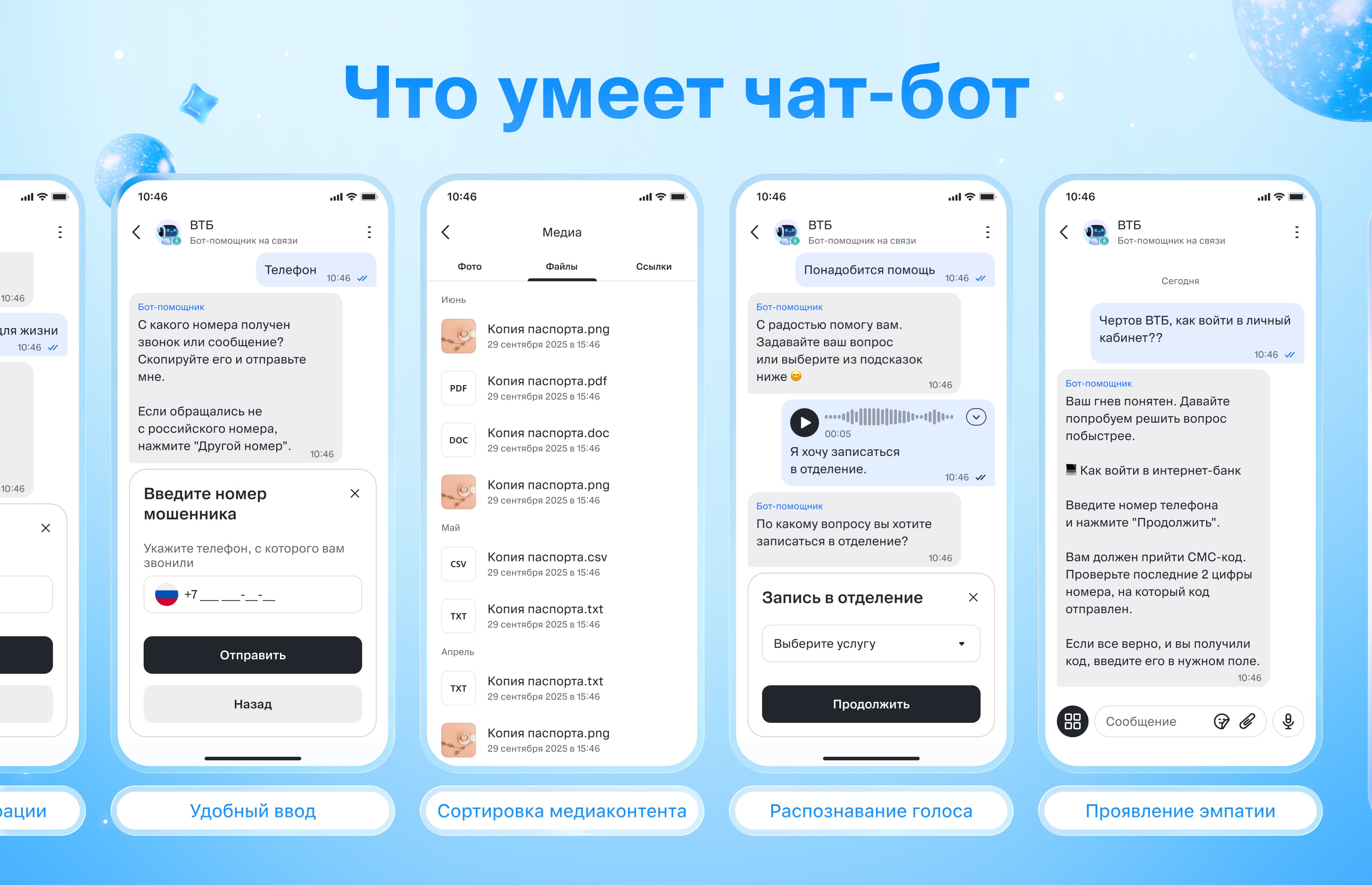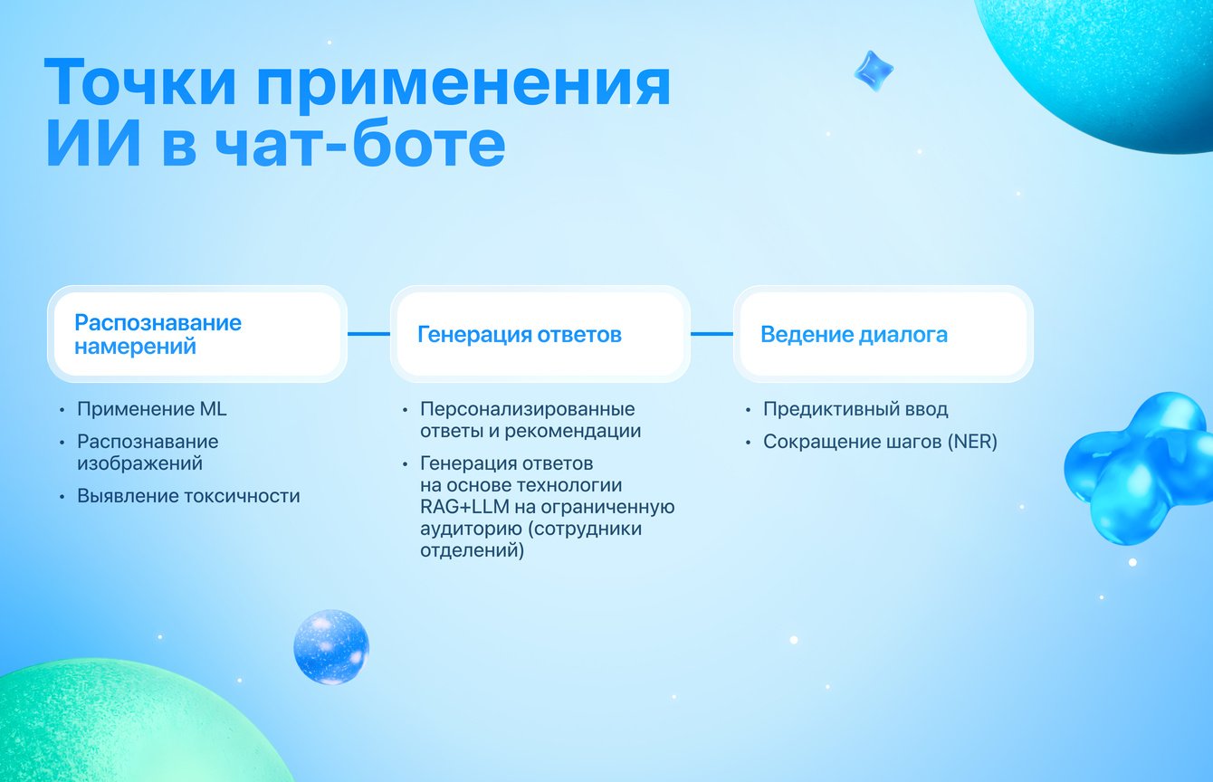 Бот научился извлекать из сообщений клиентов ключевые сущности в реальном времени: суммы, даты, номера карт и счетов, типы операций, номера телефонов. Параметры автоматически подставляются в сценарий без уточняющих вопросов. Та же технология выделяет негативные маркеры и переключает бота в эмпатичный режим — удовлетворённость по проблемным диалогам выросла на 2,5 п.п.
