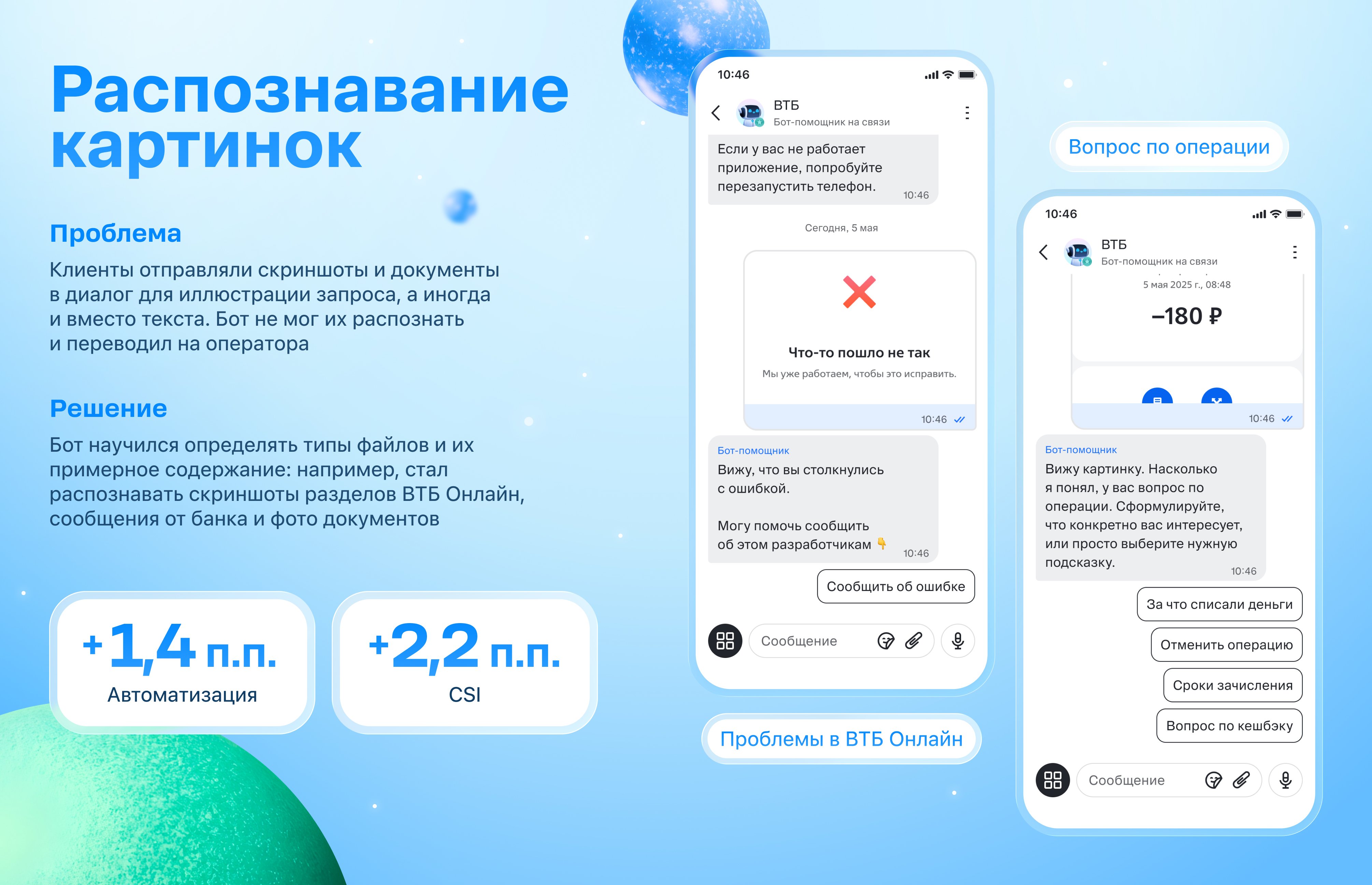 Клиенты регулярно присылали скриншоты экранов ВТБ Онлайн, фото документов, сообщения от банка — ранее бот не мог их интерпретировать. Внедрённая модель машинного зрения определяет тип и содержание файла (ошибка в приложении, выписка, документ) и корректно маршрутизирует обращение без оператора. Эффект: +0,4 п.п. к автоматизации, +0,2 п.п. к CSI.