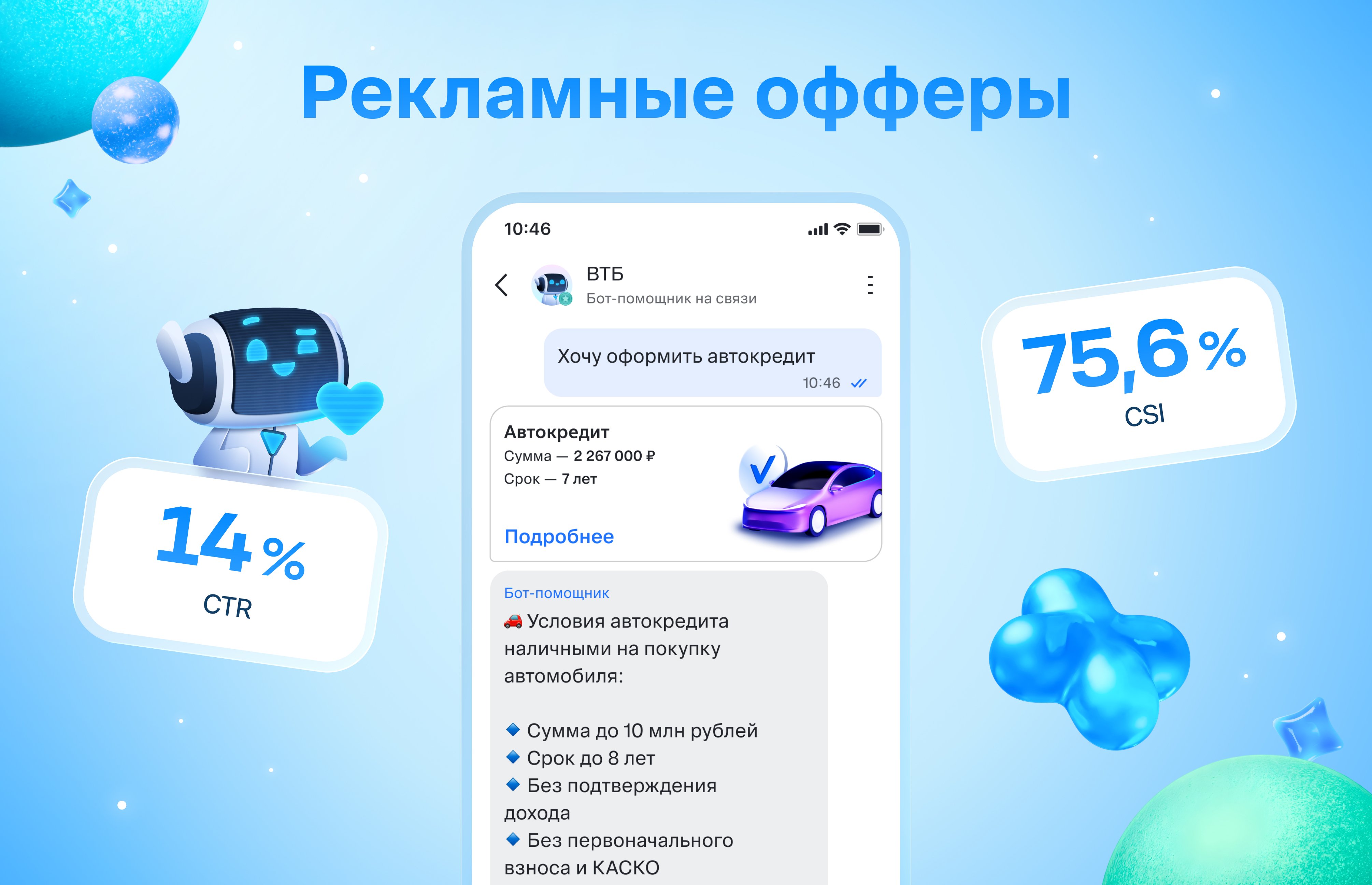 Реализована механика показа персональных офферов непосредственно в сценариях чат-бота с учётом тематики диалога и финансового профиля клиента. CTR составил 14% — один из лучших показателей среди всех цифровых каналов банка.