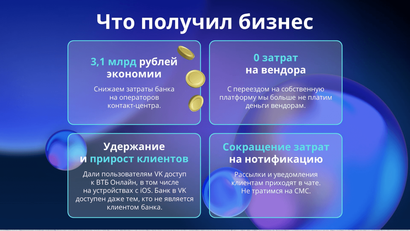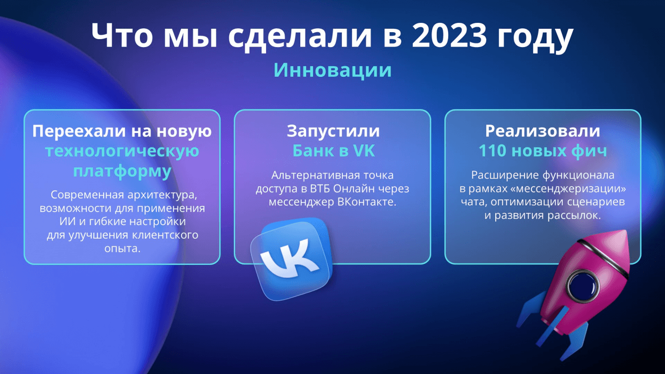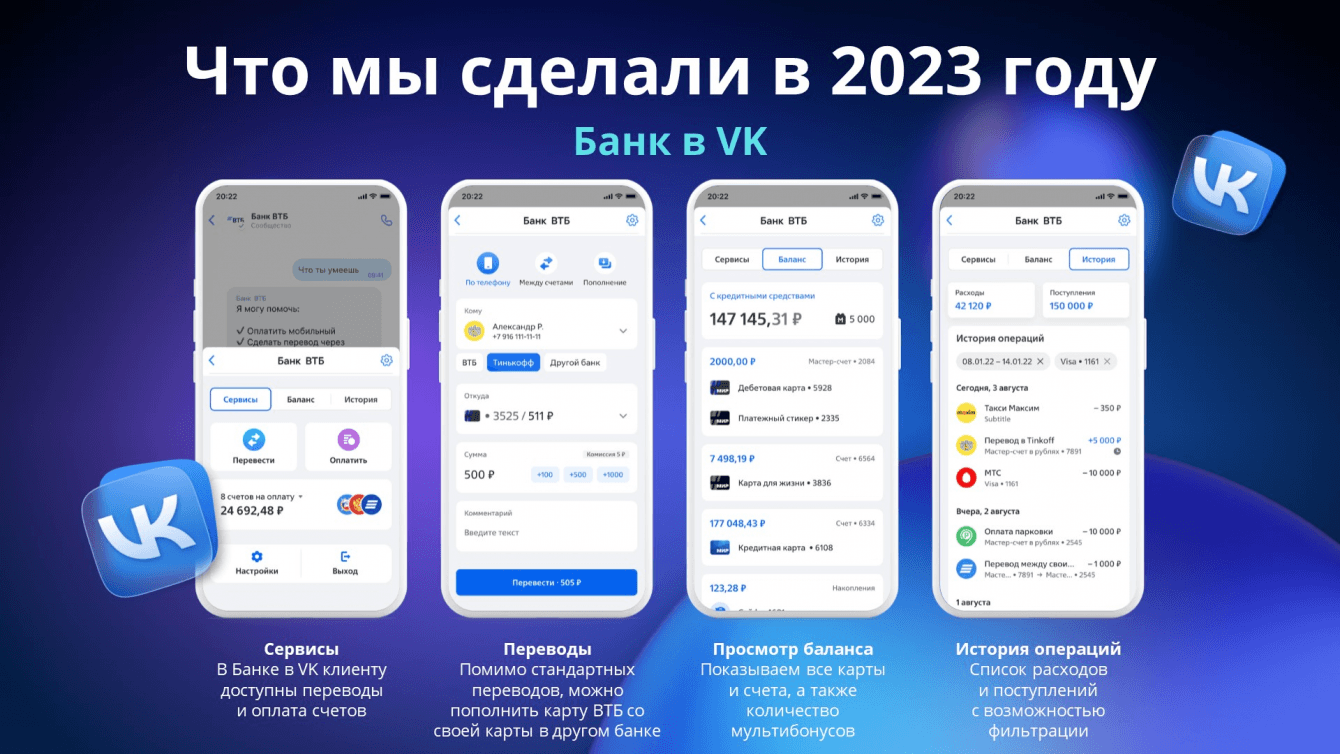 Особняком стоит Банк в VK, который мы запустили в 2023 году на базе платформы «ВКонтакте». Инновационное решение дает доступ к банковским услугам любому человеку, зарегистрированному в мессенджере VK..