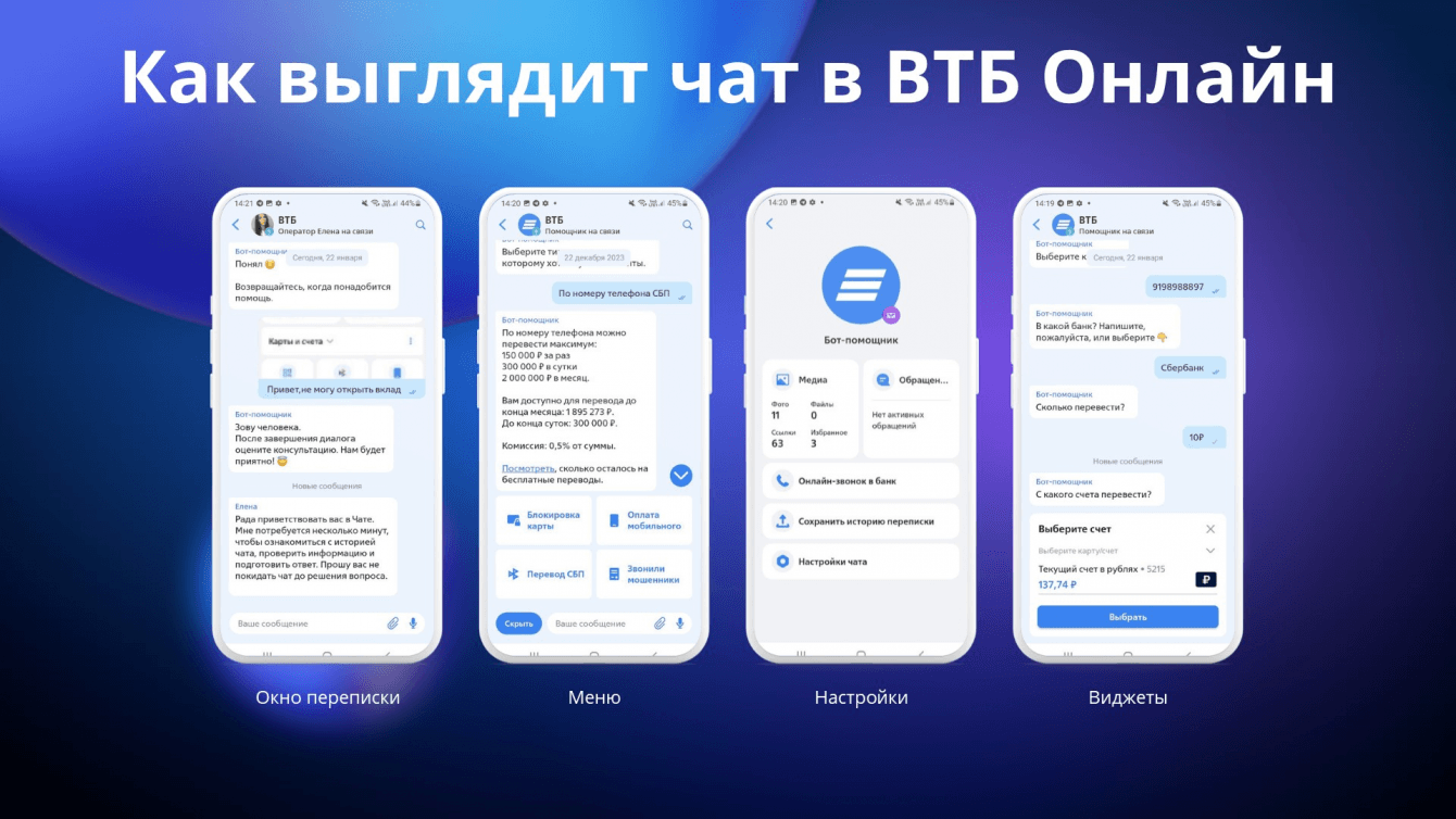Общение с клиентами — один из наиболее важных ориентиров ВТБ для улучшения качества услуг и создания комфортной среды при управлении финансами. Чат-бот ВТБ Онлайн консультирует по услугам, помогает совершать операции, может напомнить полезную информацию об открытых продуктах. Если пользователь предпочтет беседу с оператором, чат-бот подключает к общению человека.