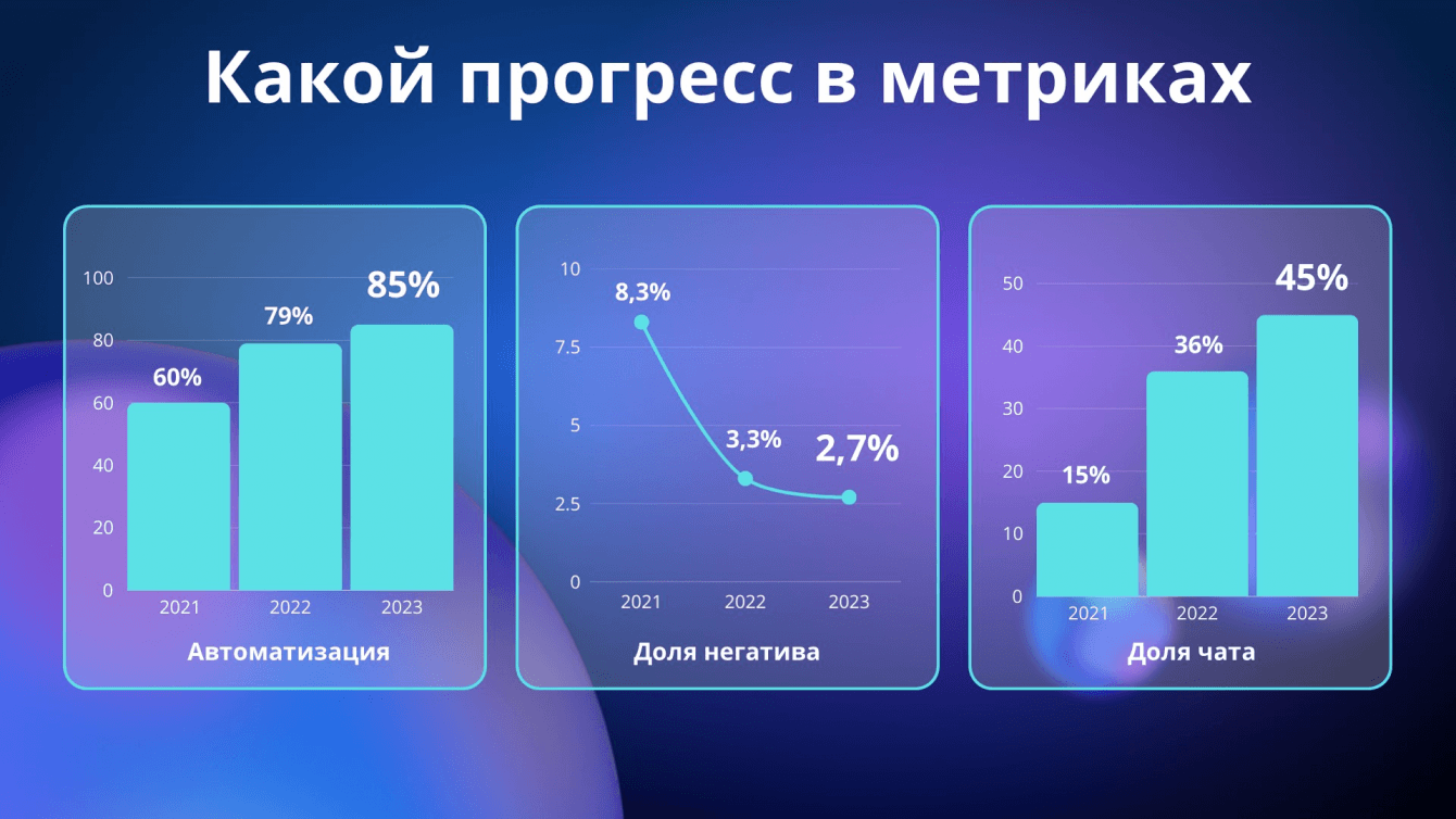 В рамках задачи мы перенесли 1600+ ответов бота, 50+ интеграционных сценариев. За полгода нам удалось перенести тот объем функционала, который до этого внедрялся в течение 5 лет. В результате мы сохранили такие же высокие показатели качества, как и до начала проекта. При этом увеличили автоматизацию до 85%. В новой гибридной модели (правила +машинное обучение) распознавание отрабатывает в 1,5 точнее, чем раньше.