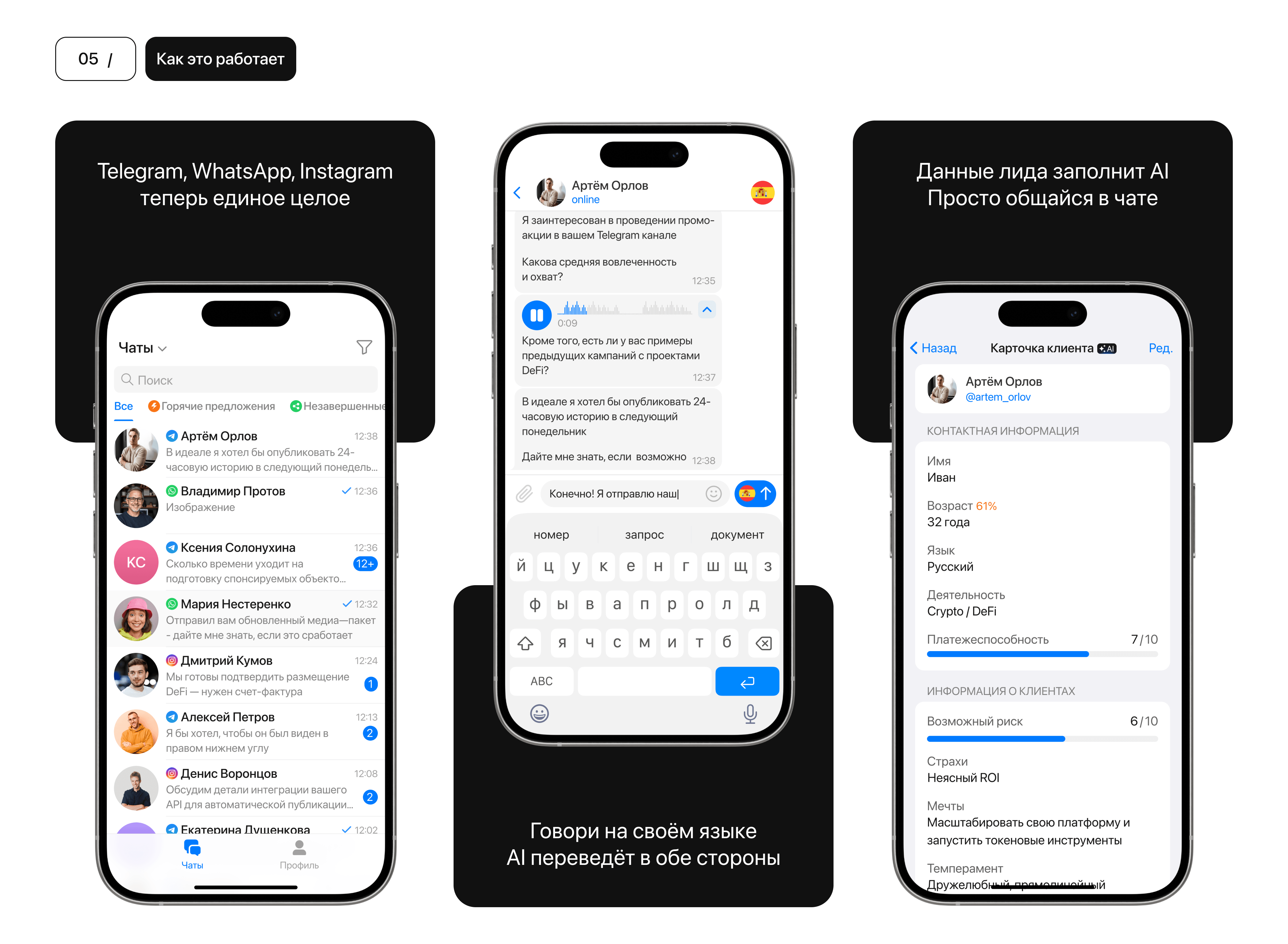 ChatLab разработан как единое рабочее пространство, где менеджеры видят только имена клиентов без прямых контактов. Продукт проектироваллся под нагрузку 100+ чатов в день на одного менеджера. Встроенный переводчик позволил русскоязычной команде вести комфортную коммуникацию с лидами на 16+ ГЕО, менеджеры закрывали сделки даже на иврите 🇮🇱
