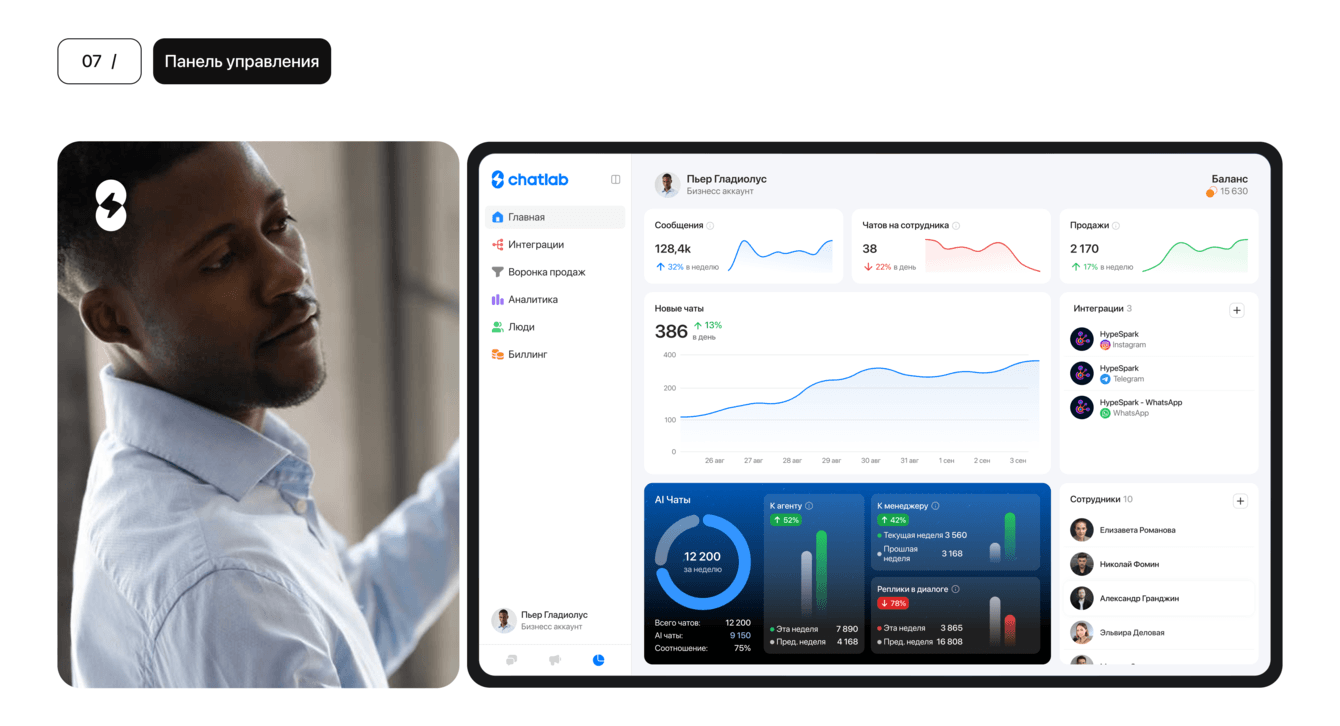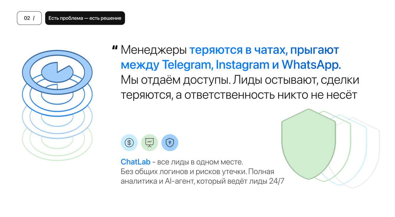 ChatLab — продукт для отдела продаж из 300 менеджеров, рассчитанный на работу с большим потоком заявок из Telegram, WhatsApp и Instagram