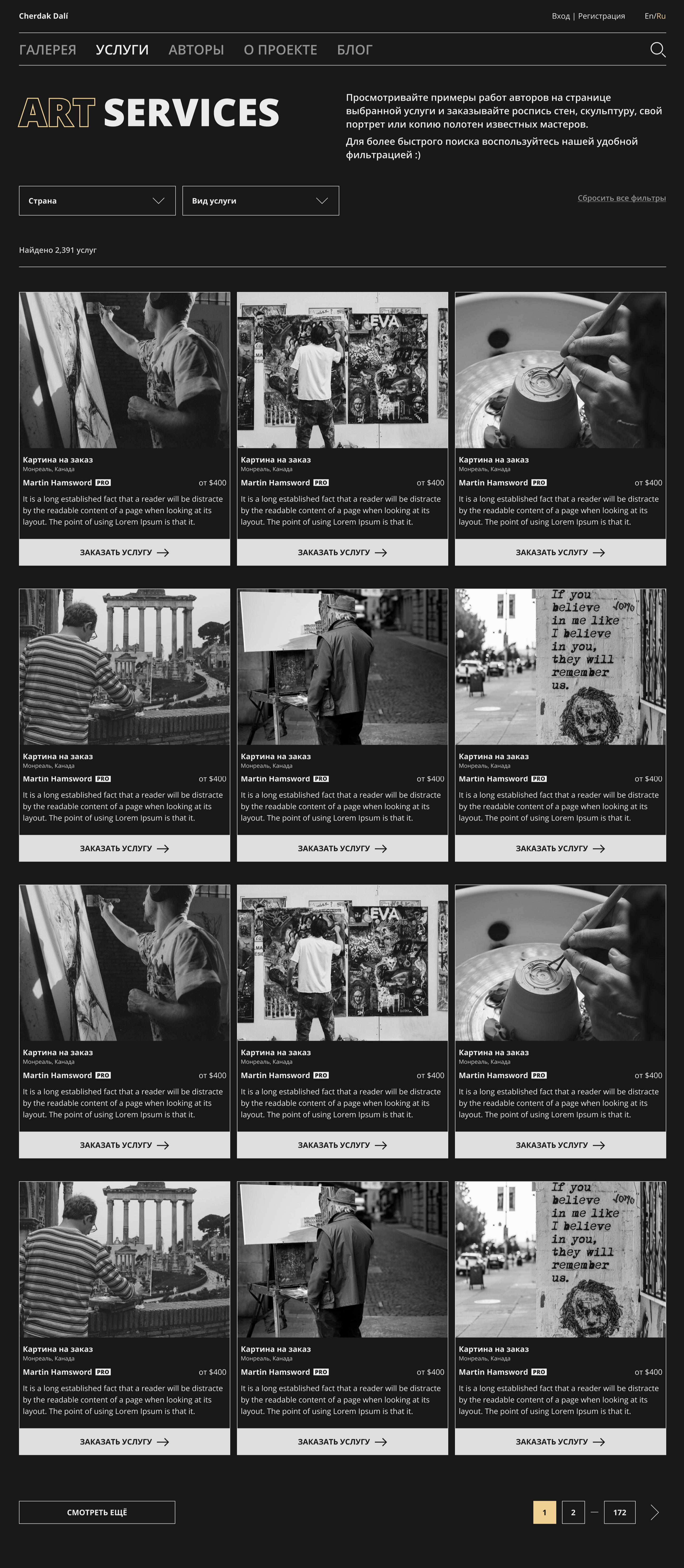 На странице "Услуги" представлен каталог с удобной сортировкой и фильтрацией — выберите автора и оформите заказ.