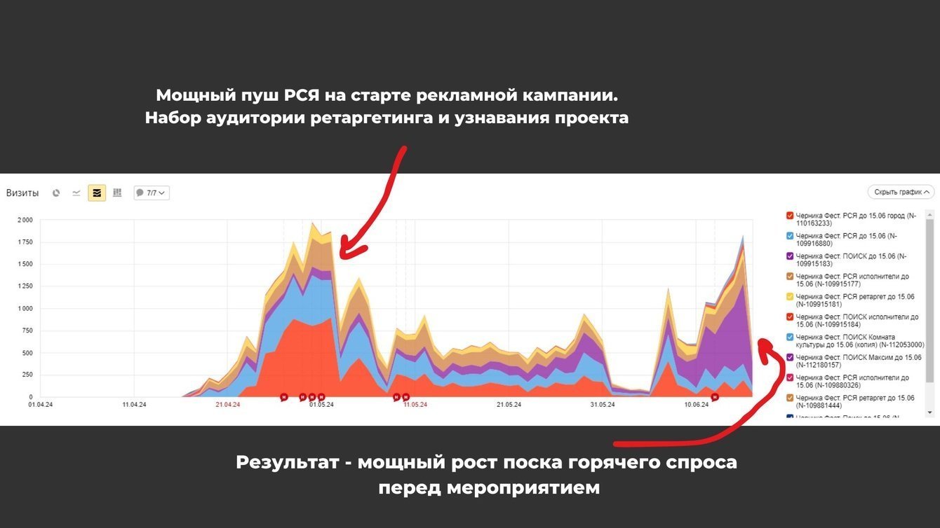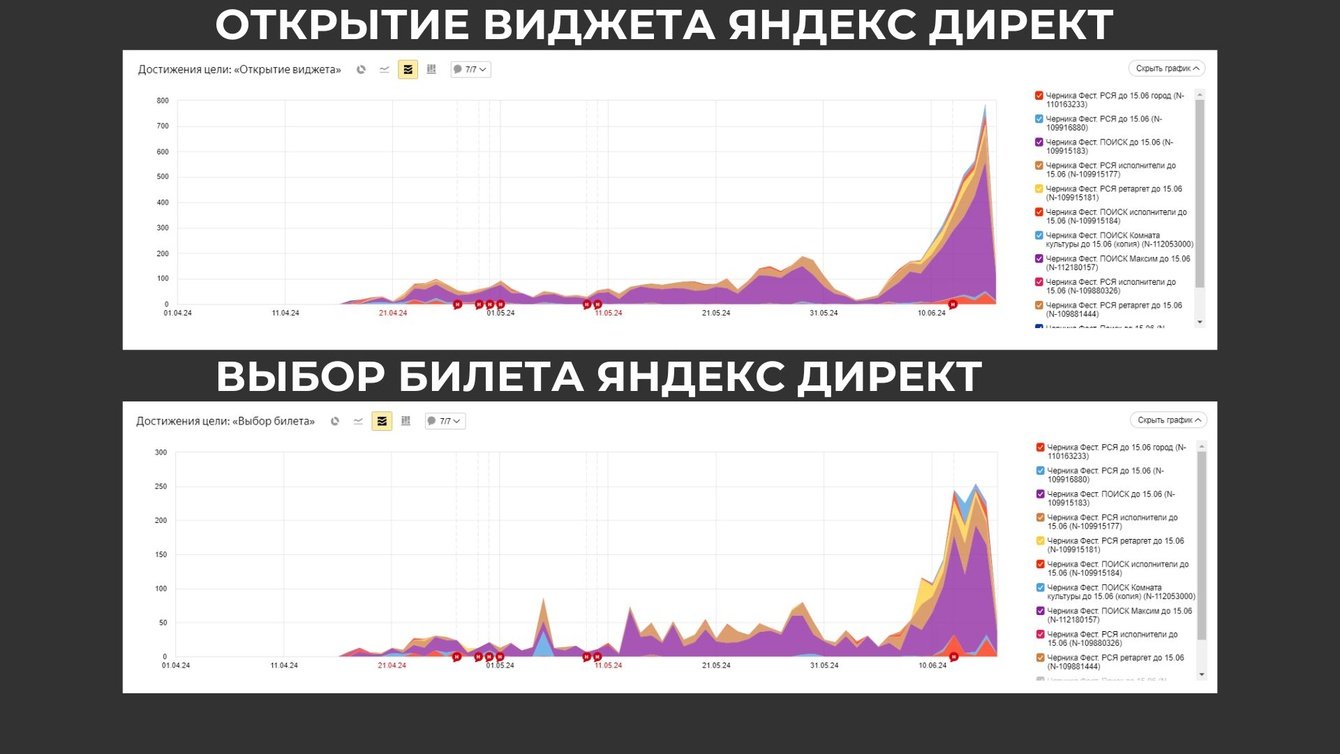 Через несколько дней после запуска мы масштабировали РК и расширили РСЯ на широкие запросы — РСЯ город (афиша, площадка, концерт), хотя планировали сделать это позже на пару недель.