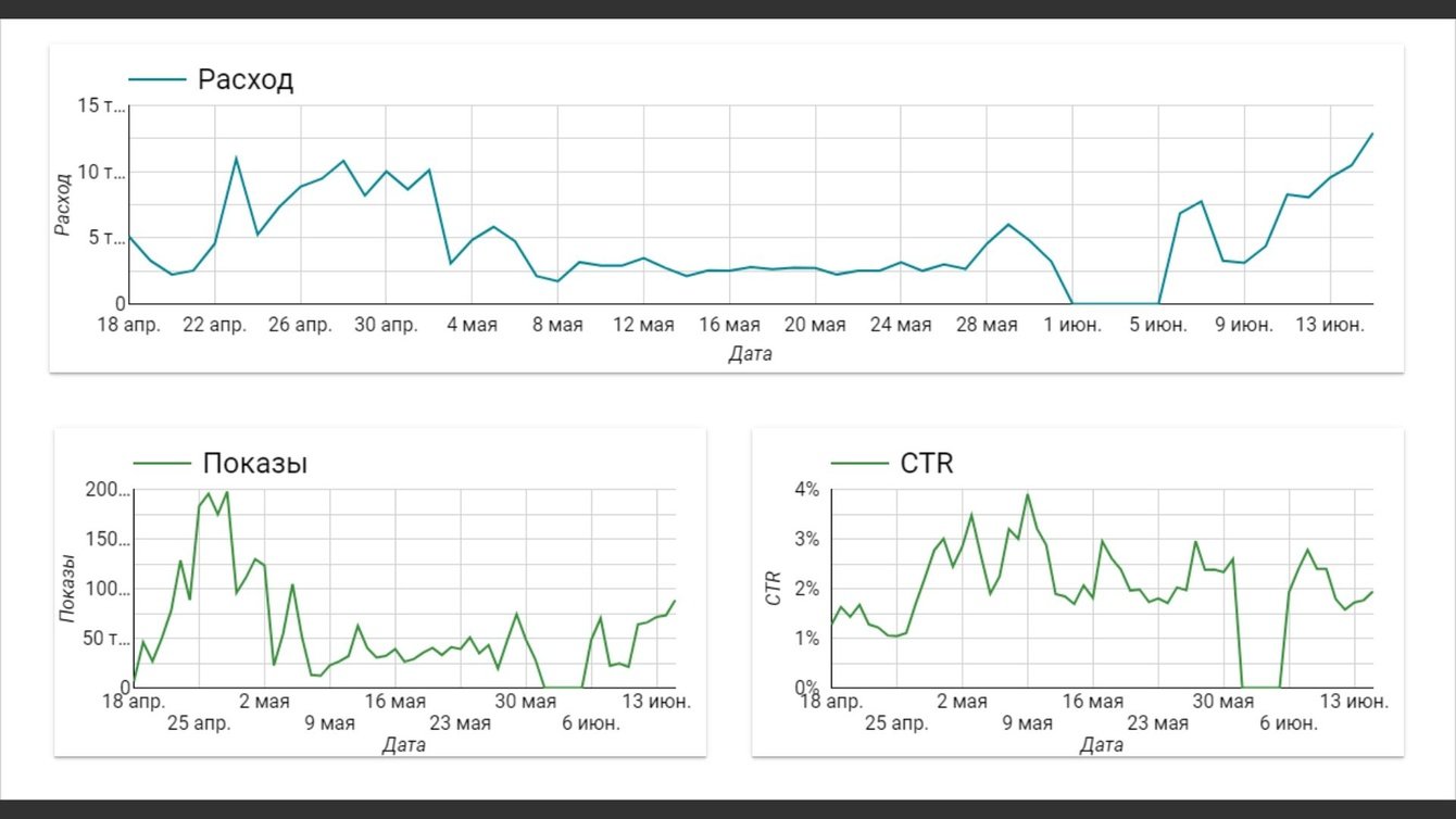 При этом по всем РСЯ CTR не падал ниже 2%, а процент отказов в среднем держался на уровне 20%. Большая часть бюджета ушла на РСЯ.