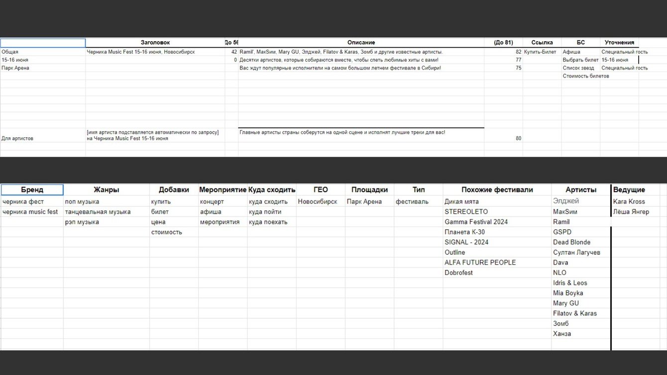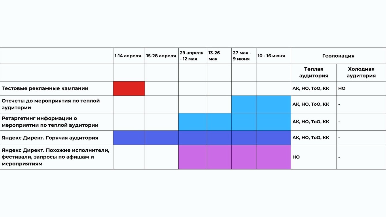 Аудитория по общим запросам - афиша, концерты и т д+ регион. Деление на региональные кампании
