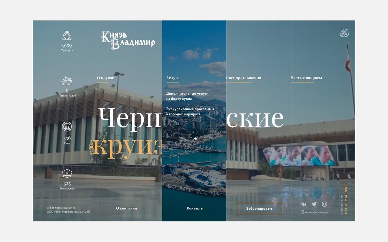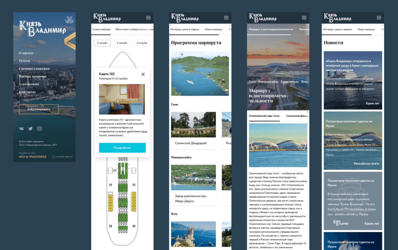 Дизайн сайта выполнен с соблюдением морской тематики, помогая пользователям погрузиться в круизную атмосферу на лайнере "Князь Владимир".
