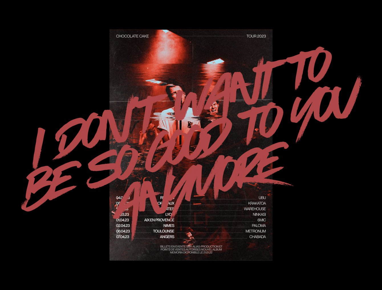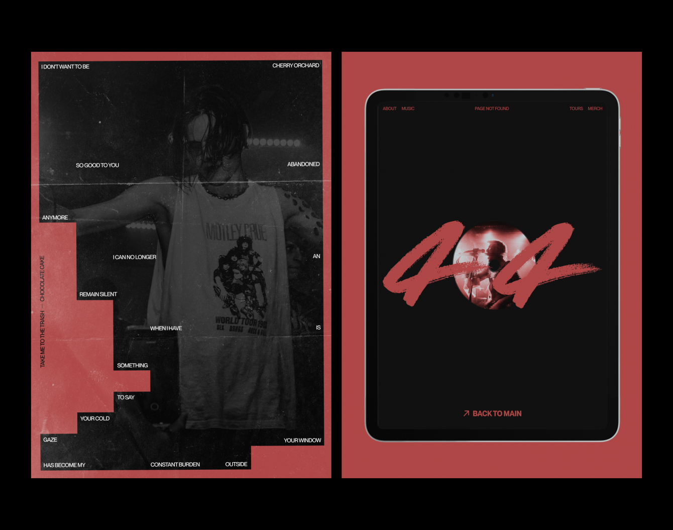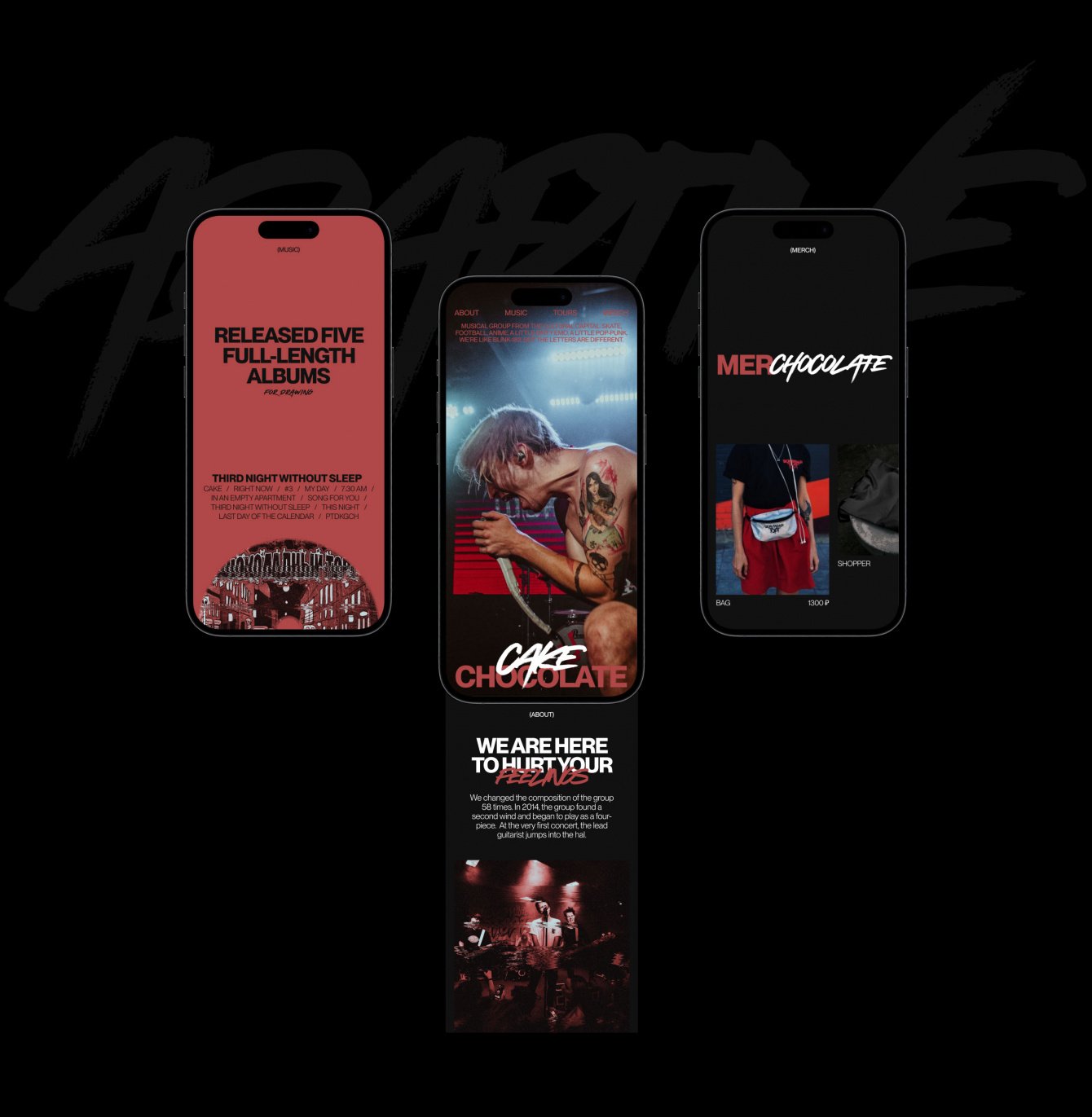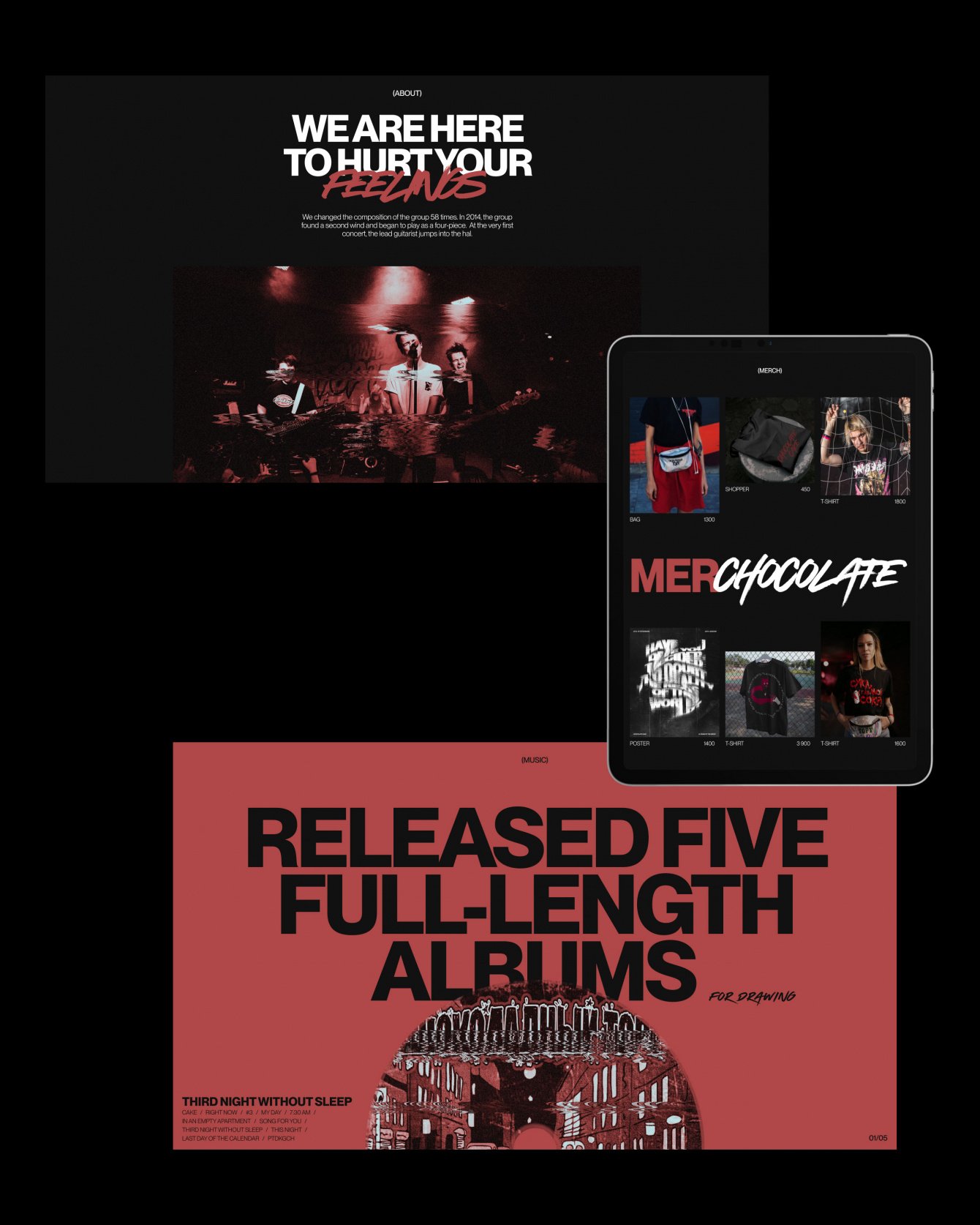 Группа Шоколадный торт — это взрывное трио из Санкт-Петербурга. Мы взялись за этот проект не только потому что нам нравится эта группа. Нам хотелось снова поработать с крупной типографикой, акцидентными шрифтами и темными цветами.