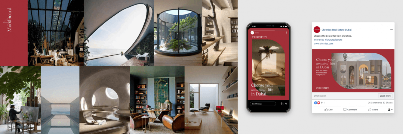 Четвертый креатив посвящен эстетической стороне недвижимости: насыщенный бордовый цвет из брендбука компании усилил связь Christie’s с темой искусства, пронизывающей бренд и все разработанные нами креативы.