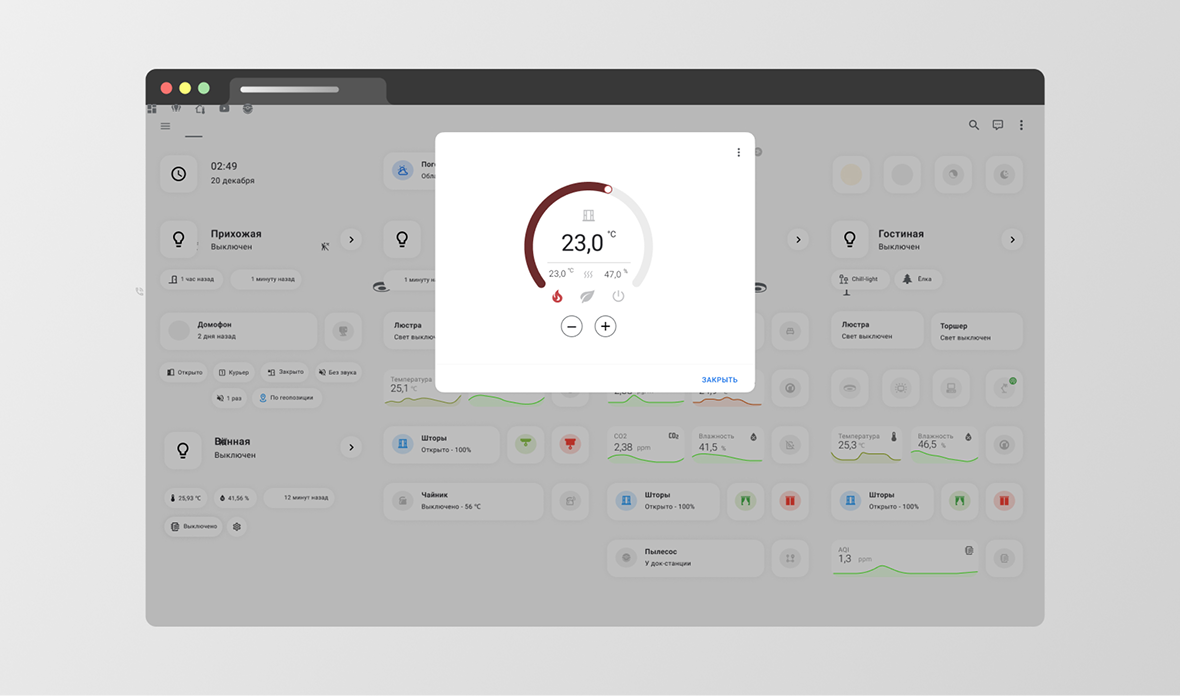 Для создания интерфейса у нас был выбор: стандартный конструктор дашбордов от Home Assistant или собственная разработка. Конструктор не давал нужной гибкости — на нём нельзя было выстроить логику под конкретные зоны и привычки заказчика, поэтому написали интерфейс с нуля.