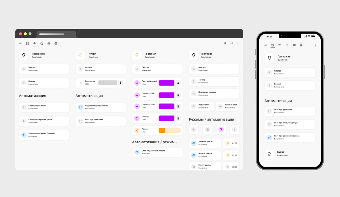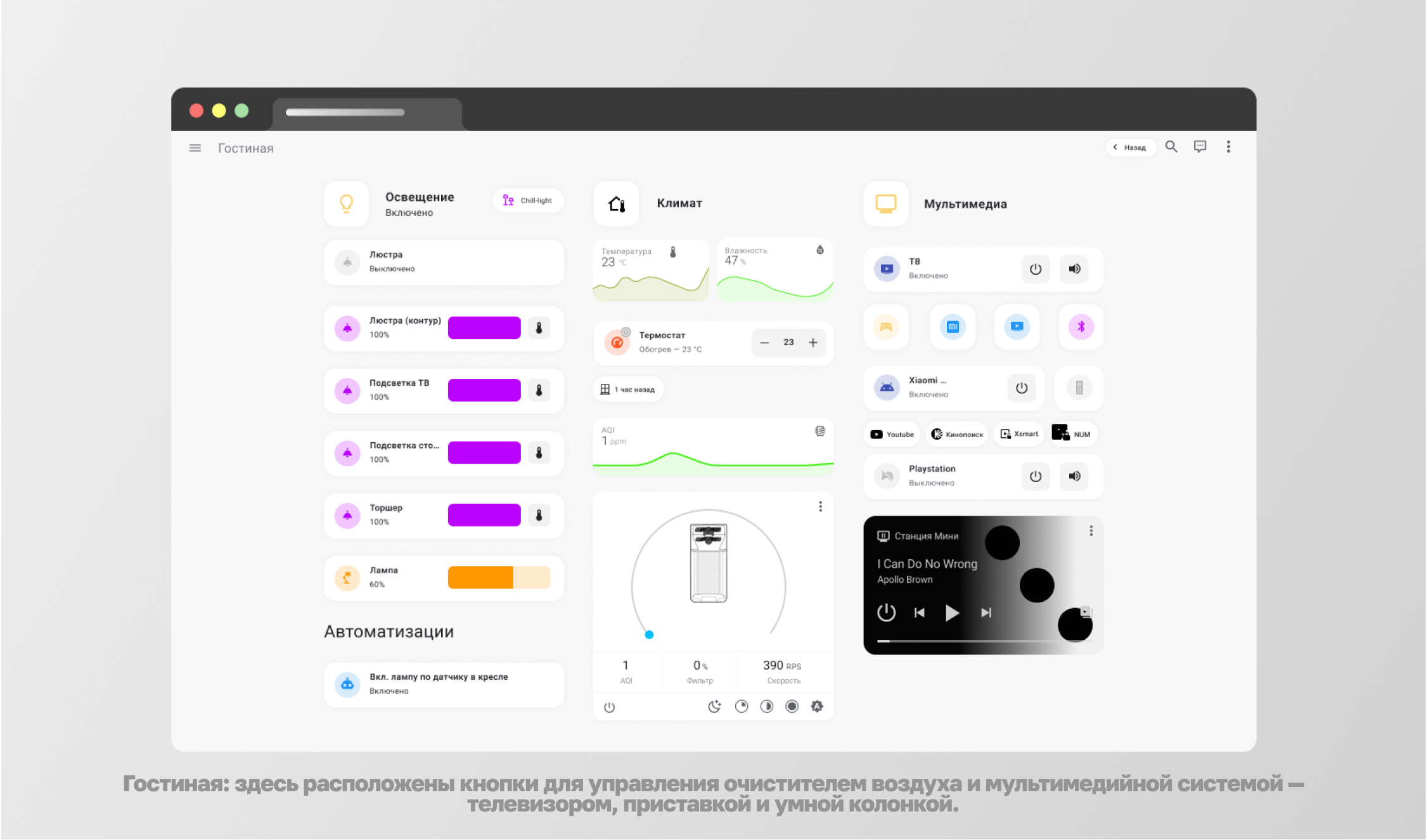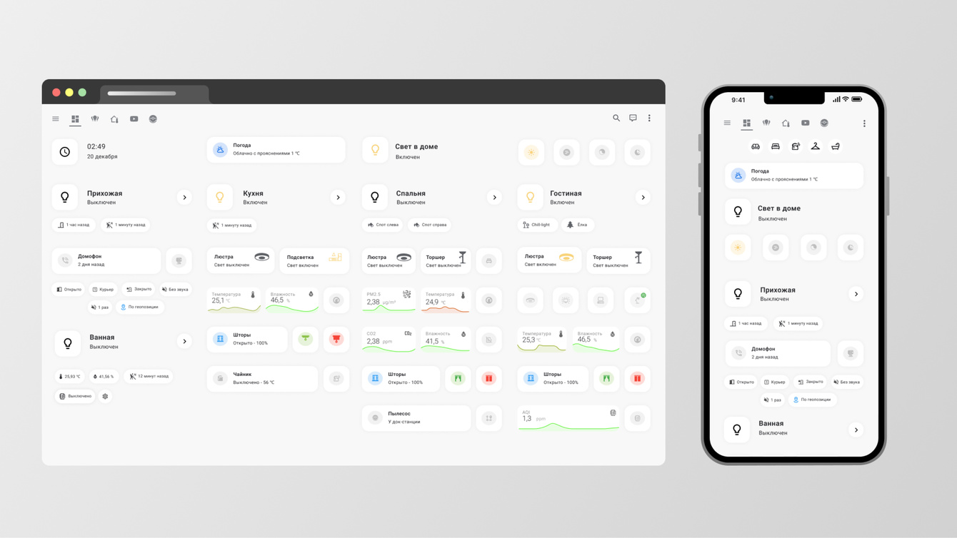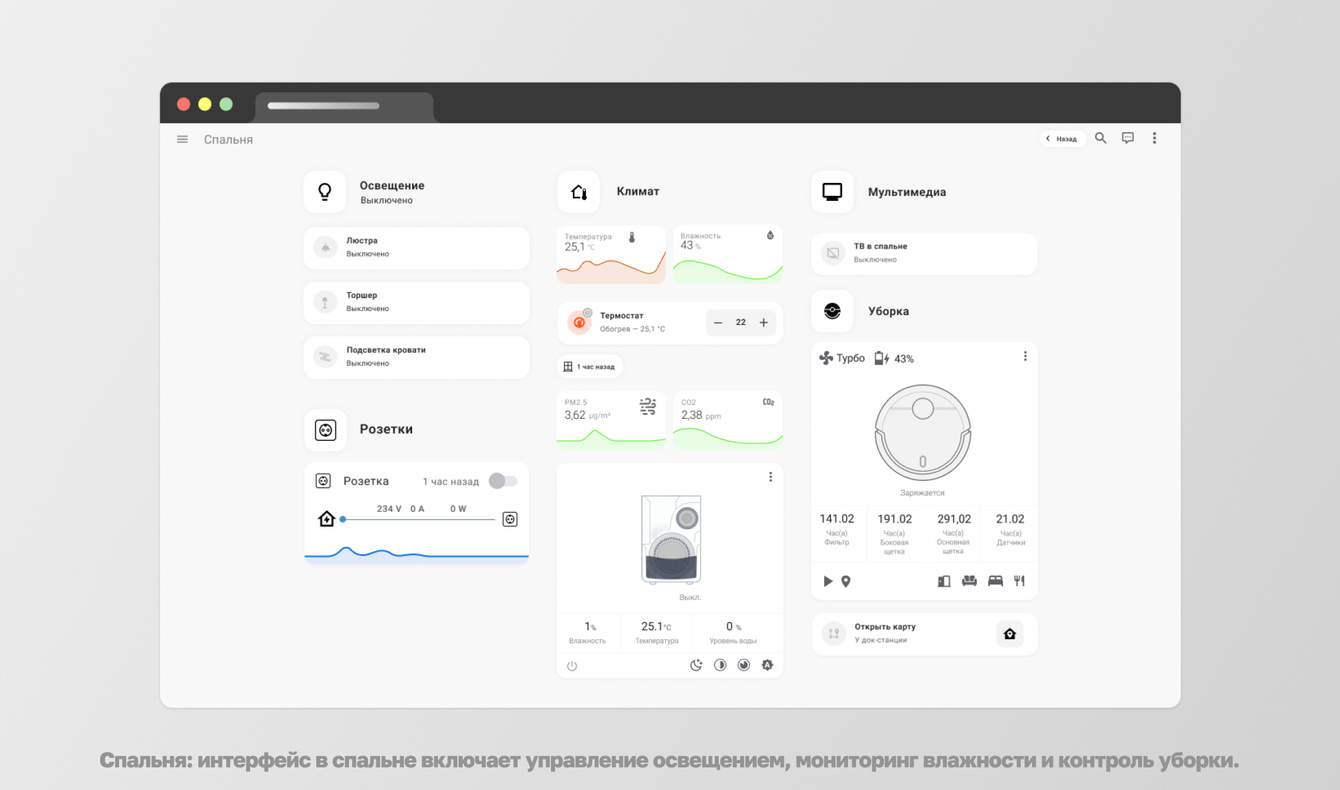 1) Робот-пылесос, увлажнитель, Яндекс Станция, PlayStation 5 — всё это тоже есть в системе. Имеют свои карточки управления и участвуют в общих сценариях.
