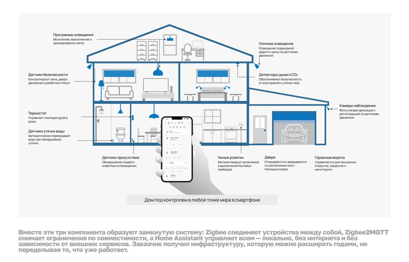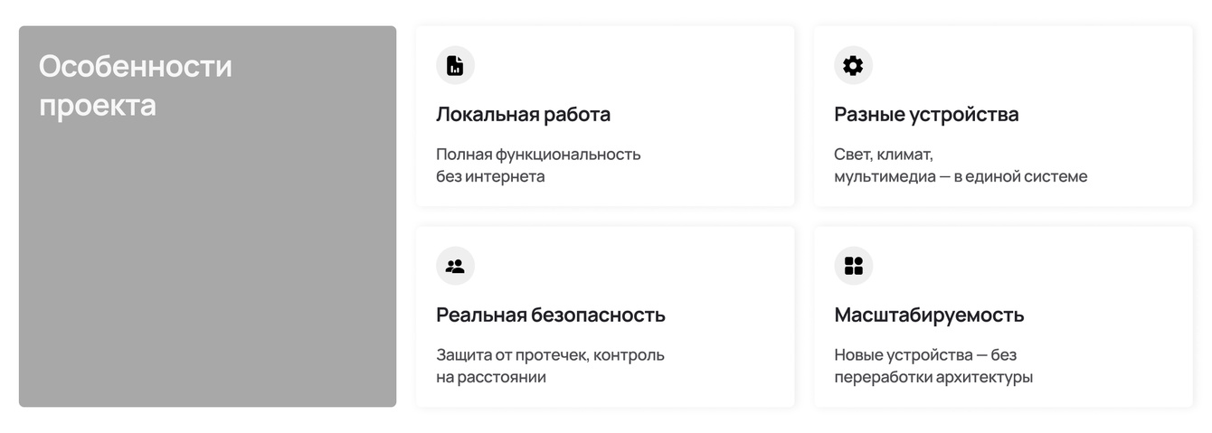 Задача сводилась к условиям: система должна работать локально, не зависеть от провайдера, поддерживать разнородное оборудование и покрывать реальные бытовые сценарии — от управления климатом до защиты от протечек.