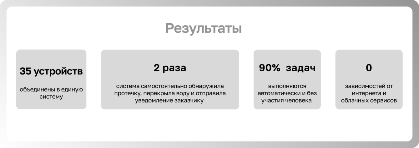 Через четыре месяца после запуска система работает в штатном режиме, а архитектура, которую мы заложили, позволяет Заказчику самостоятельно добавлять новые устройства и сценарии.