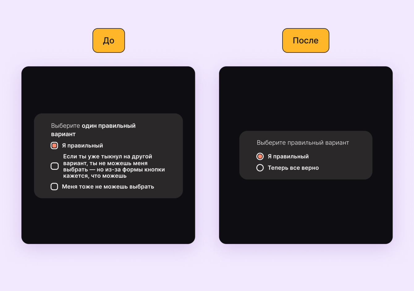 Например, в тестах в приложении есть вопросы, где нужно выбрать один вариант ответа. Дизайнер отрисовал кнопки на этих вариантах как чекбоксы, а не радиокнопки.
